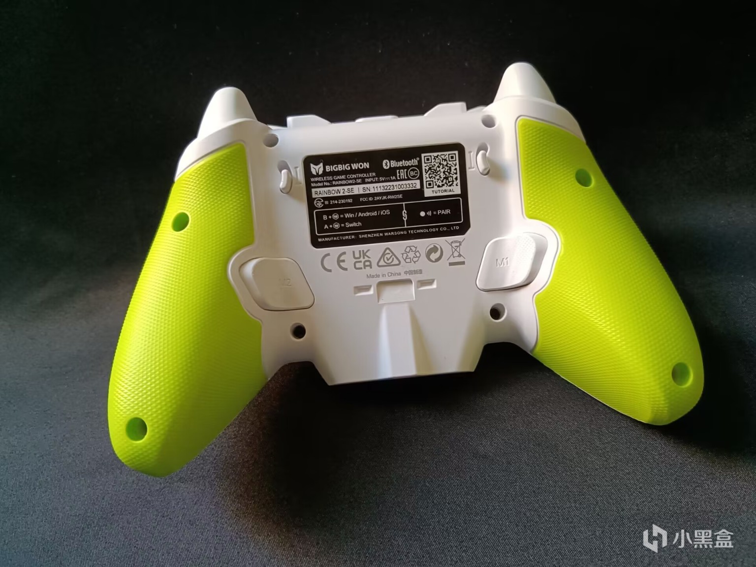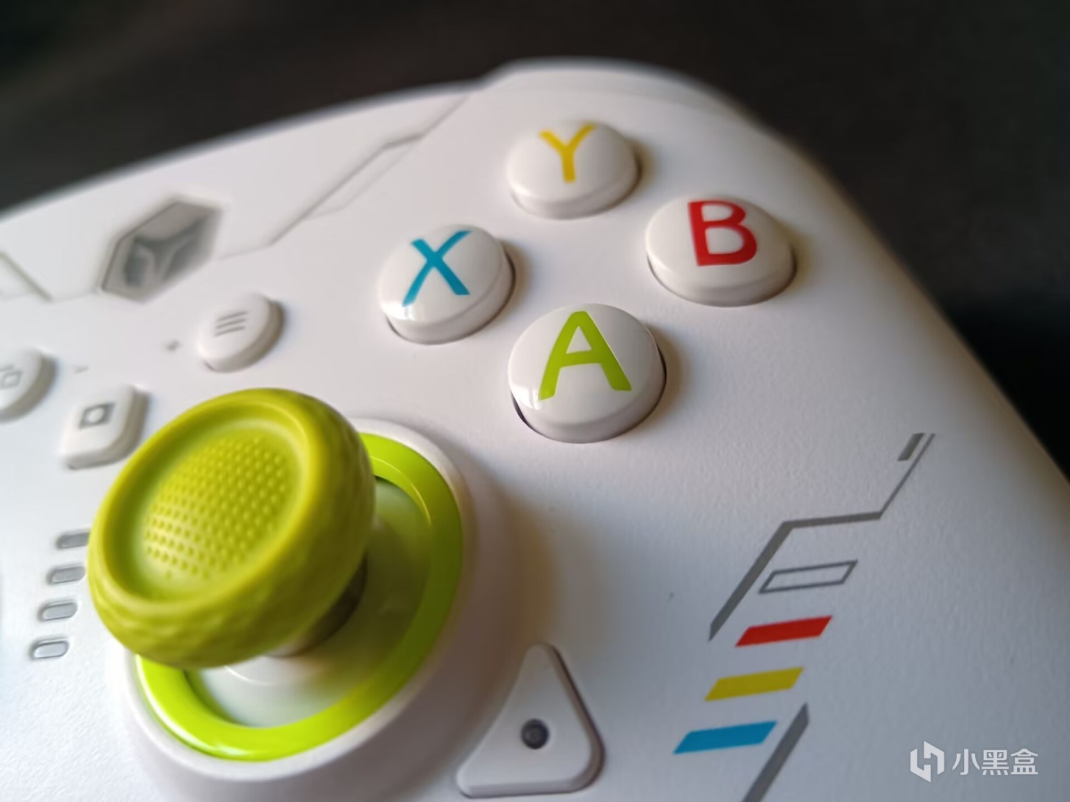 首先是外觀,雖然是彩虹系列,但是彩虹2SE並沒有像前面的手柄一樣是透明外殼,而是做成了白實色外殼,畢竟也不是誰都喜歡透明外殼和光污染,兩側是由藍、黃、紅、白條紋組合成的紋樣,也可以說是契合彩虹這個主題了,然後正面和彩虹2 Pro一樣下方有一塊突起,佈置了連發、改鍵、宏錄製和配置共四個實體按鍵,Home鍵部分,打開之後就是綠色,可以說是非常地貼合我選擇的顏色。