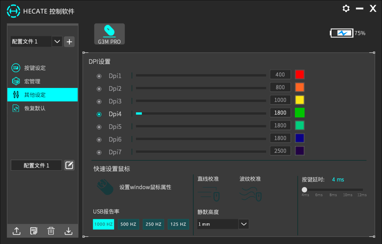 下載安裝打開驅動,你會發現多達8個檔位的DPI調節,意味着如果你不小心誤觸到了調節DPI的按鍵,你要再按6次這個鍵才能調回來(應該沒算錯吧)。當然你也可以索性把所有DPI都調成相同參數,徹底規避誤觸的可能