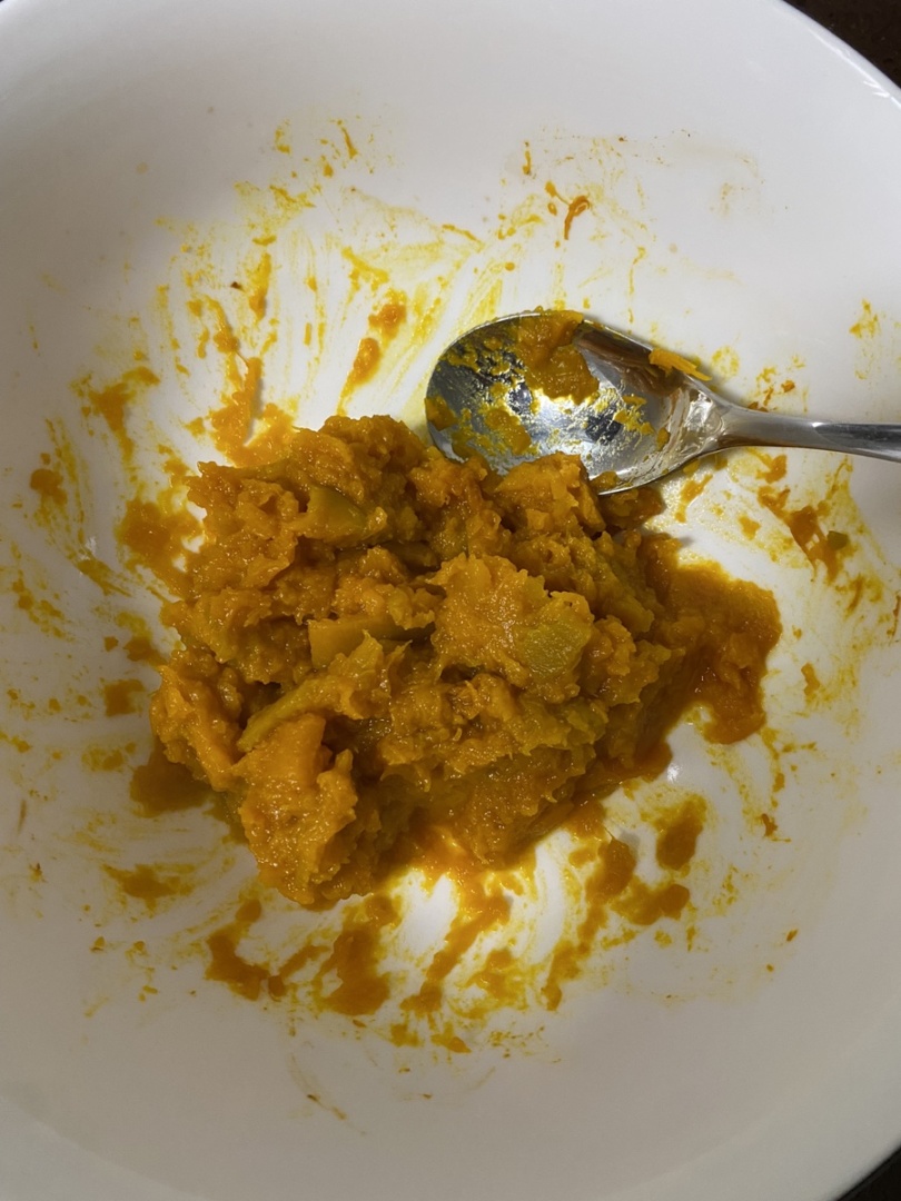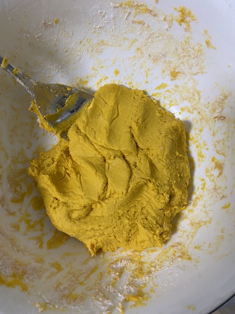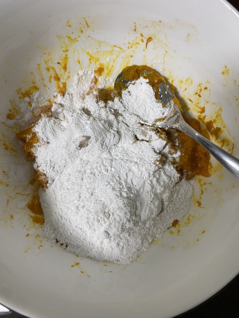 4.加入糯米粉,加多少根據你的南瓜多少放,就是最後要能不粘手的狀態