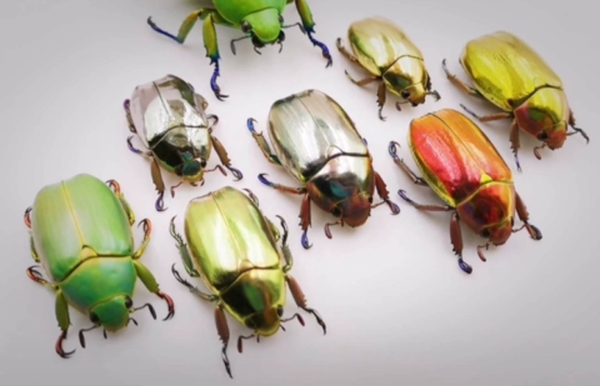 這些寶石金龜表面複雜的多層結構,能夠使它在不同的圓偏振光下呈現出這些不同的色彩。