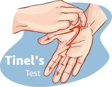 Tinel徵:叩擊腕部正中神經部位,如拇指、食指和中指出現疼痛麻木等異常感覺,提示腕管綜合徵。
