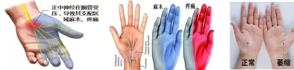 1、手麻:主要表現手掌側的拇指、食指、中指和無名指的一側感覺減退、有麻木感,對冷、熱也不敏感,經常會有夜間麻醒情況,睡醒之後手經常麻木,甩手之後會有明顯的緩解。