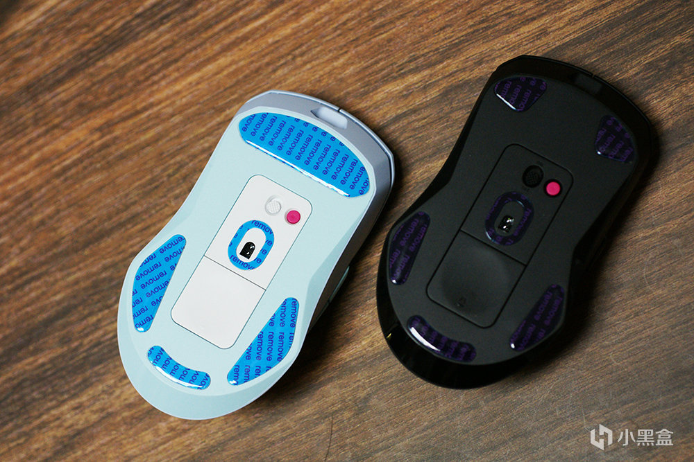 在VT9 Pro和VT9 Pro mini鼠標的底部均自帶防滑腳墊,而且配件中多配備了一套,中間是原相定製3398光學引擎(3395高定版),旁邊還有獨立開關鍵和紅色自定義DIY鍵(出廠默認設置爲DPI切換)。
