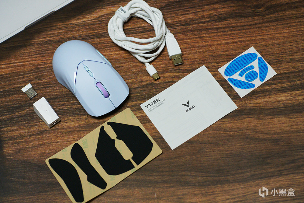 雷柏VT9 Pro可選配色十分豐富,除了常見的黑、白之外,還有灰、紫、粉、藍等多種選擇,這是我選的是淺藍色,先來看看全家福,除了鼠標本體之外,還包括傘繩數據線、2.4G無線接收器、USB-A TO Type-C接口轉換器、按鍵防滑貼、備用特氟龍腳墊。