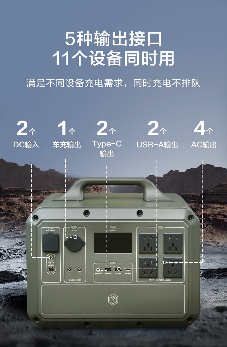接口方面,該戶外移動電源配備 5 種接口,分別爲 2 個 DC 接口、1 個車充輸出接口、2 個 USB-C 接口、2 個 USB-A 接口、4 個 AC 輸出接口,支持 11 臺設備同時充電。