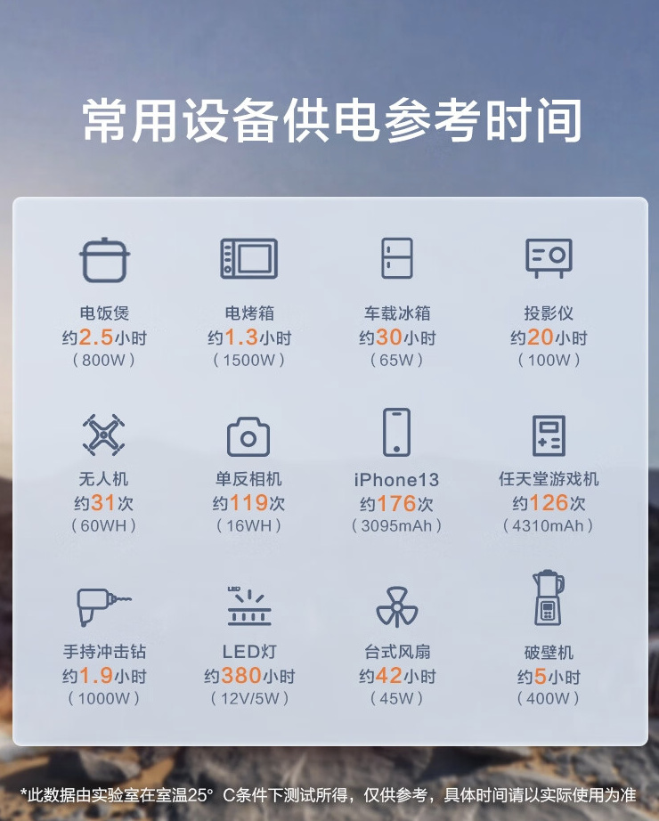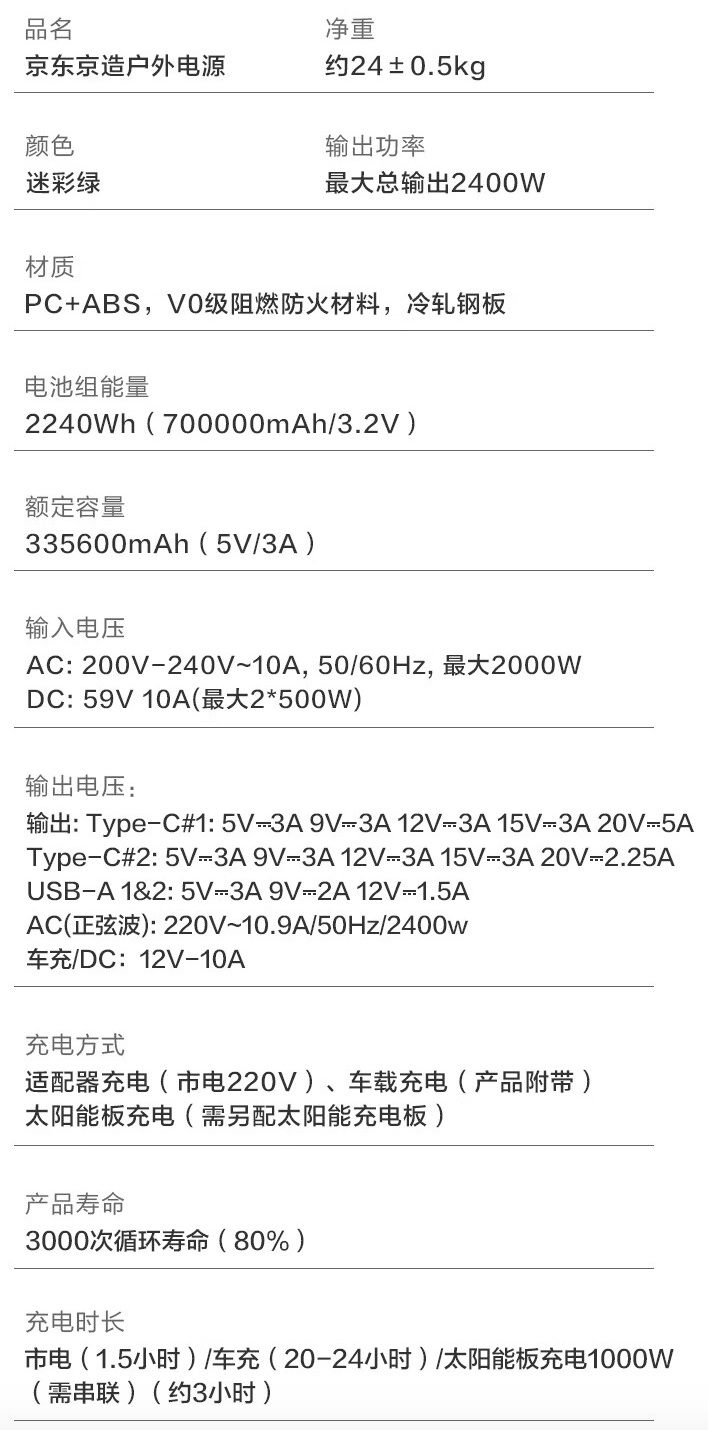 官方介紹稱,該戶外移動電源重量爲 24 千克,標稱容量 2240Wh(700000 毫安時),支持爲電飯煲、電烤箱、投影儀、無人機、手機、遊戲機等設備供電,號稱可爲容量 60 Wh 的無人機充 31 次電,爲蘋果iPhone13 手機 3095 毫安時充 176 次電。