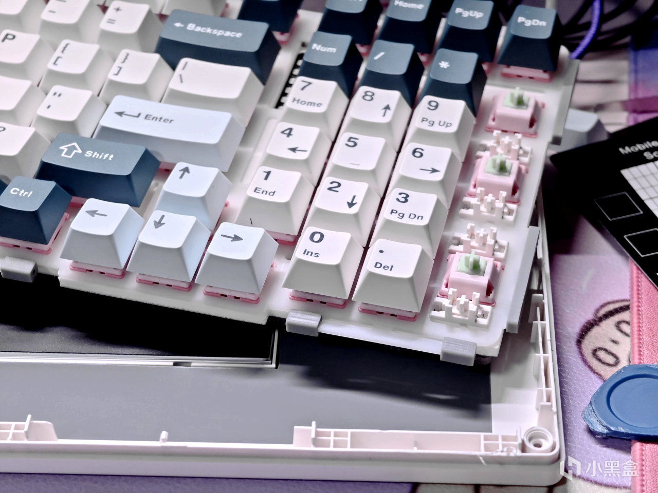 除了保留之前CL98的板簧Gasket結構+熱插拔+高質量RGB背光+無線三模+ixpe軸下墊+硅膠底墊,還有非常頂的軸體:阿尼亞軸和極光冰淇淋軸+更軟彈的單間開槽PCB+6000mAh電池
