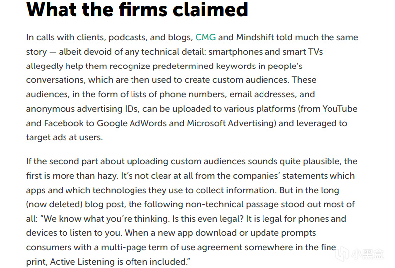 早在去年 12 月,Business Insider”就發現美國媒體集團 Cox Media Group(CMG)擁有一項名爲“主動竊聽”(Active Listening)的技術,可蒐集來自用戶手機及平板電腦等設備的麥克風數據,分析用戶對話,從而爲用戶推送相關廣告。