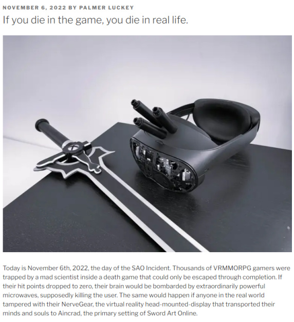 但動畫帶來的影響遠遠不止這麼簡單,如今已經賣給扎克伯格的VR工作室Oculus,其品牌創始人Palmer Luckey就是《刀劍神域》的鐵粉,經常會更新一些關於《刀劍神域》的內容。