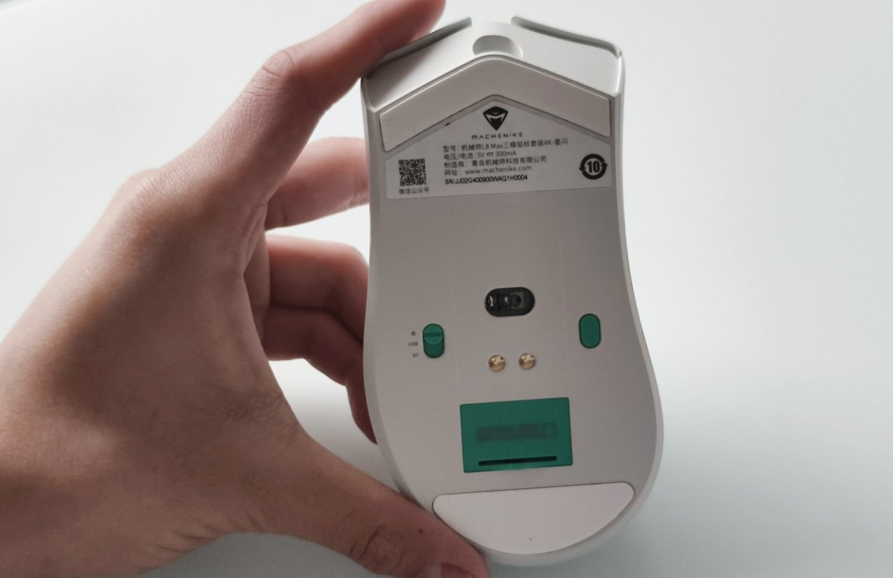 他的底部呢也就是兩個PET腳貼,使用起來十分絲滑,下方則是切換連接方式與DPI調節的按鈕,還有一個接收器的收納倉,方便你不用了之後也能方便收納,且還防塵。