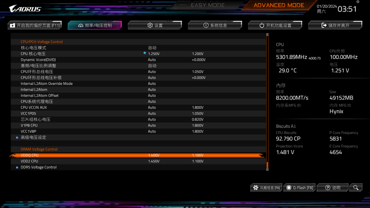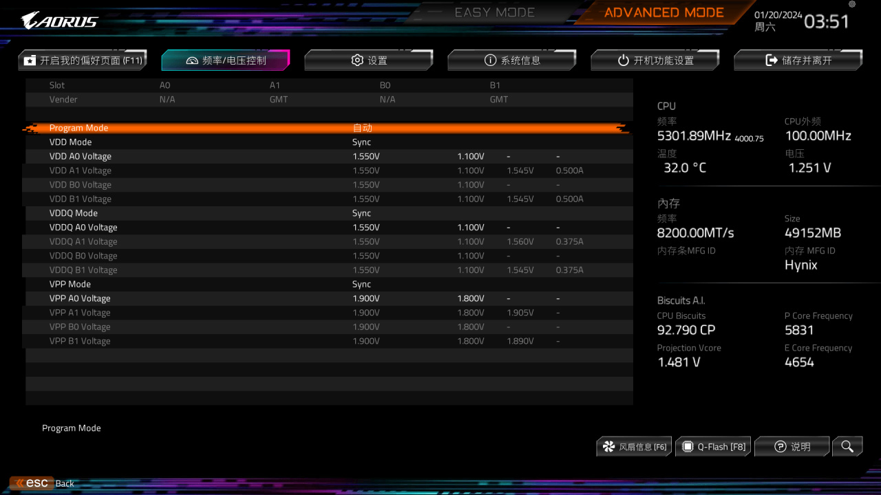 爲了進一步拉高性能上限,再次進入BIOS中手動調整電壓和內存時序。這裏我將SA電壓設置爲