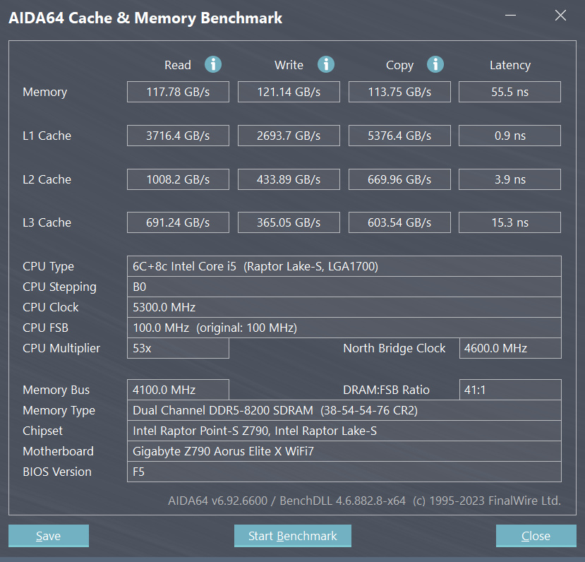 接下來再用AIDA64進行測試,讀取速度爲17.78GB/s,寫入速度爲121.14GB/s,複製速度爲113.75MB/s,延遲降低至55.5ns。可以說在性能方面有了全方位的提升。