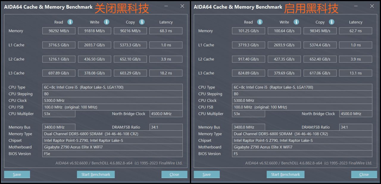 考慮到咱們既然多花錢買來6800MHz的高頻內存條,肯定也不會就運行在5600MHz默頻使用,所以這裏咱們就先直接從XMP頻率開始,使用AIDA64分別在6800MHz頻率下測試打開和關閉“高帶寬低延遲”模式的不同性能表現。