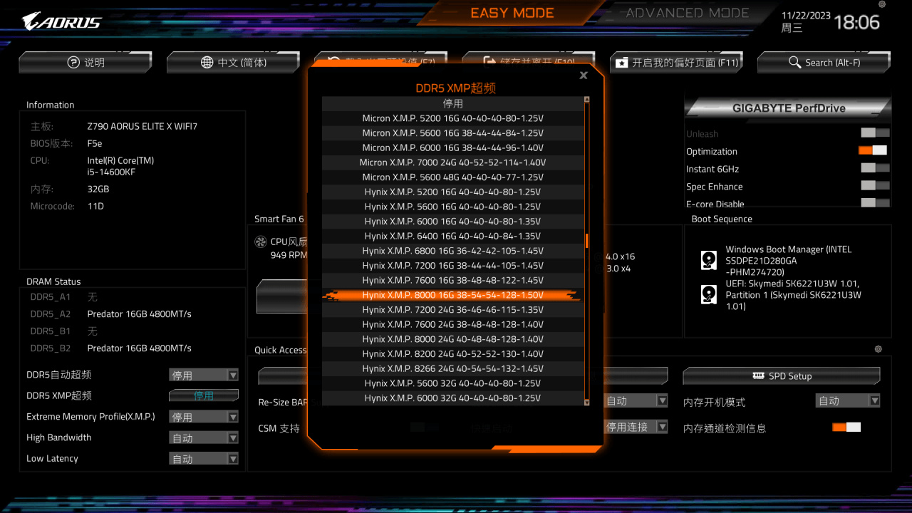 像之前想要用SK海力士A-Die顆粒超到8000MHz的話,還需要手動調整下內存電壓什麼的慢慢調試,而這套內存只需要直接用技嘉主板中內置的超頻模板就可以一步到位直接上到8000MHz,對於新手朋友來說特別輕鬆。