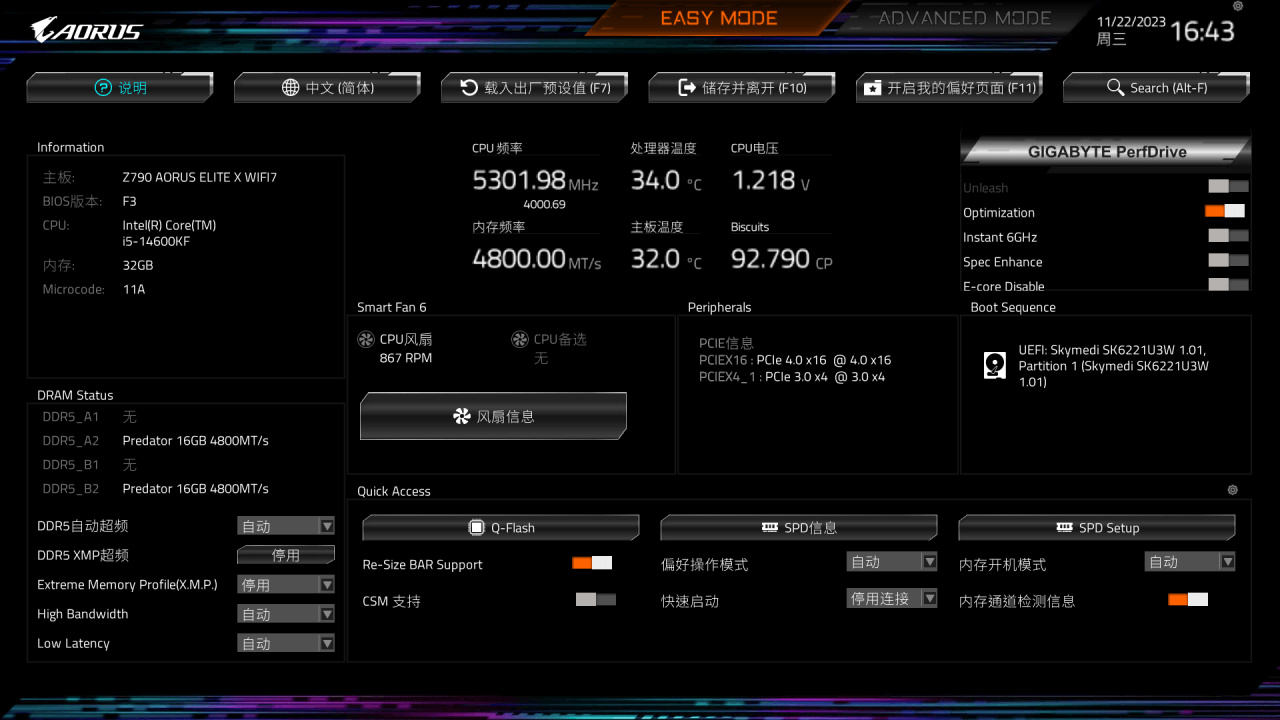 在BIOS方面,技嘉給Z790 AORUS ELITE X的BIOS界面做了全新的UI設計,即使是新手小白也能輕鬆查看到自己需要的信息,這要比之前的迷宮菜單好得太多了。