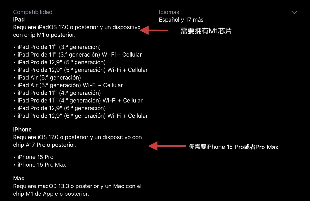 但你需要一部蘋果15pro(pro Max)或者擁有M1芯片的iPad或MacBook 纔可以運行。像我的iPad達不到要求,所以我的購買鍵是黑的