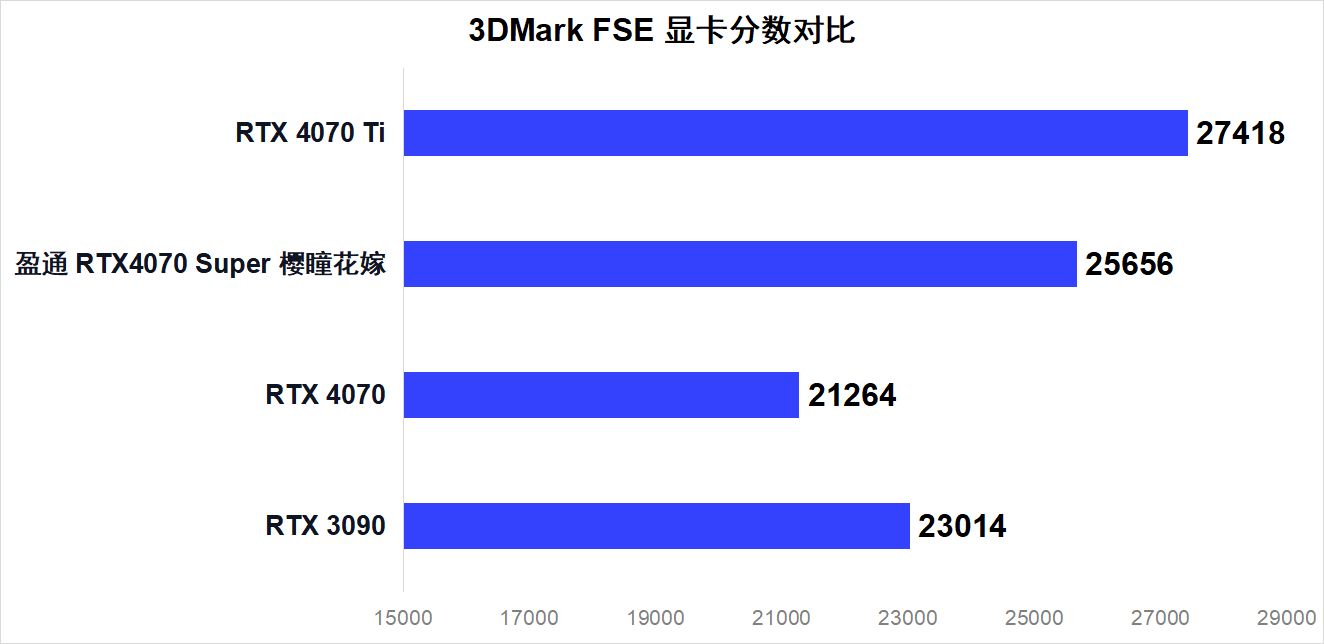 在代表DX11性能的3Dmark FSE測試中,盈通RTX 4070 Super櫻瞳花嫁的表現繼續超越上代旗艦卡皇RTX 3090,與RTX 4070的領先幅度依舊爲20%。不過與RTX 4070 Ti相比,盈通RTX 4070 Super櫻瞳花嫁的成績還是相差了6%。