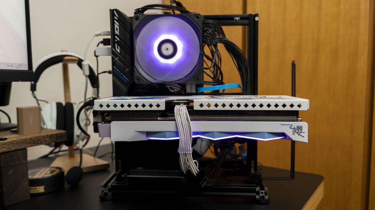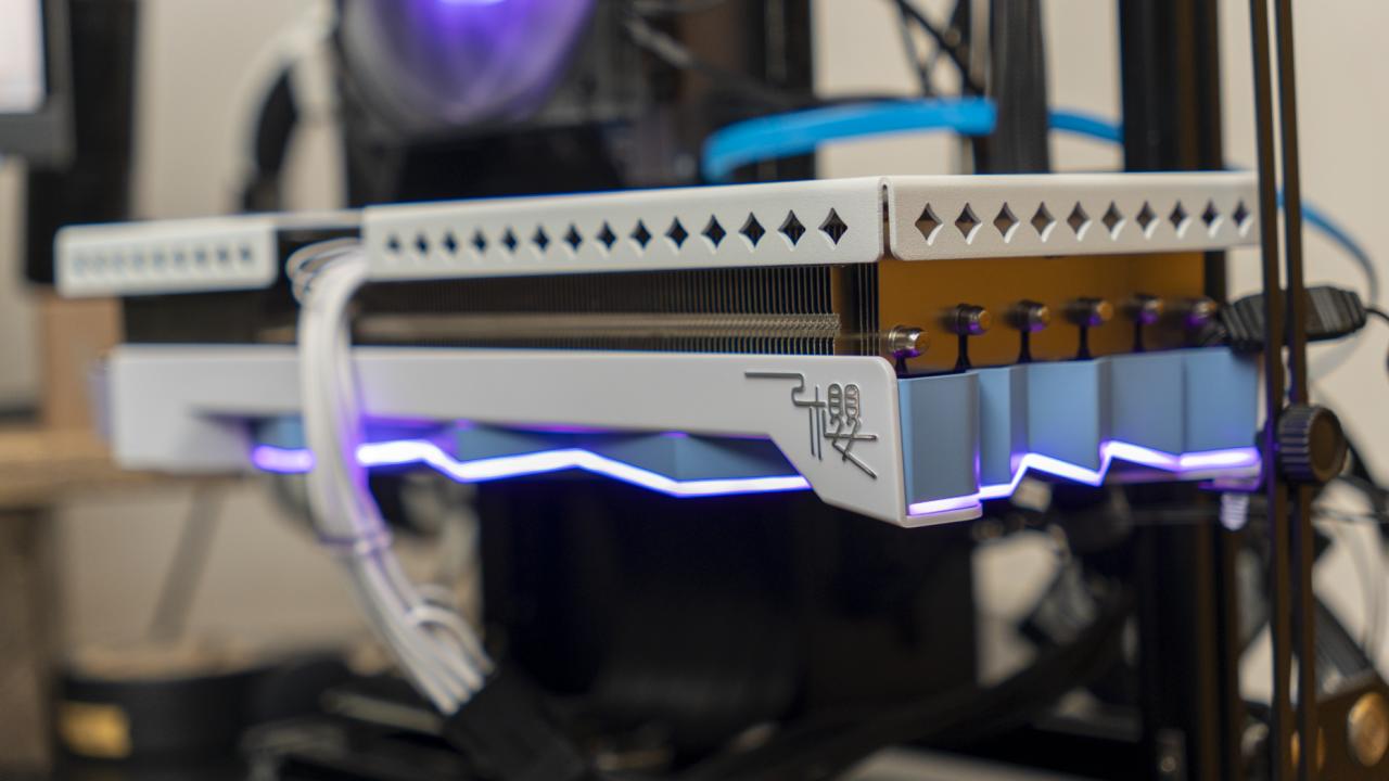 這張顯卡我最推薦的安裝方式是豎裝,可以很好的展示出正面的櫻花設計語言。同時顯卡的12VHPWR供電線也會因爲凹槽的原因,完美的隱藏到顯卡後面。