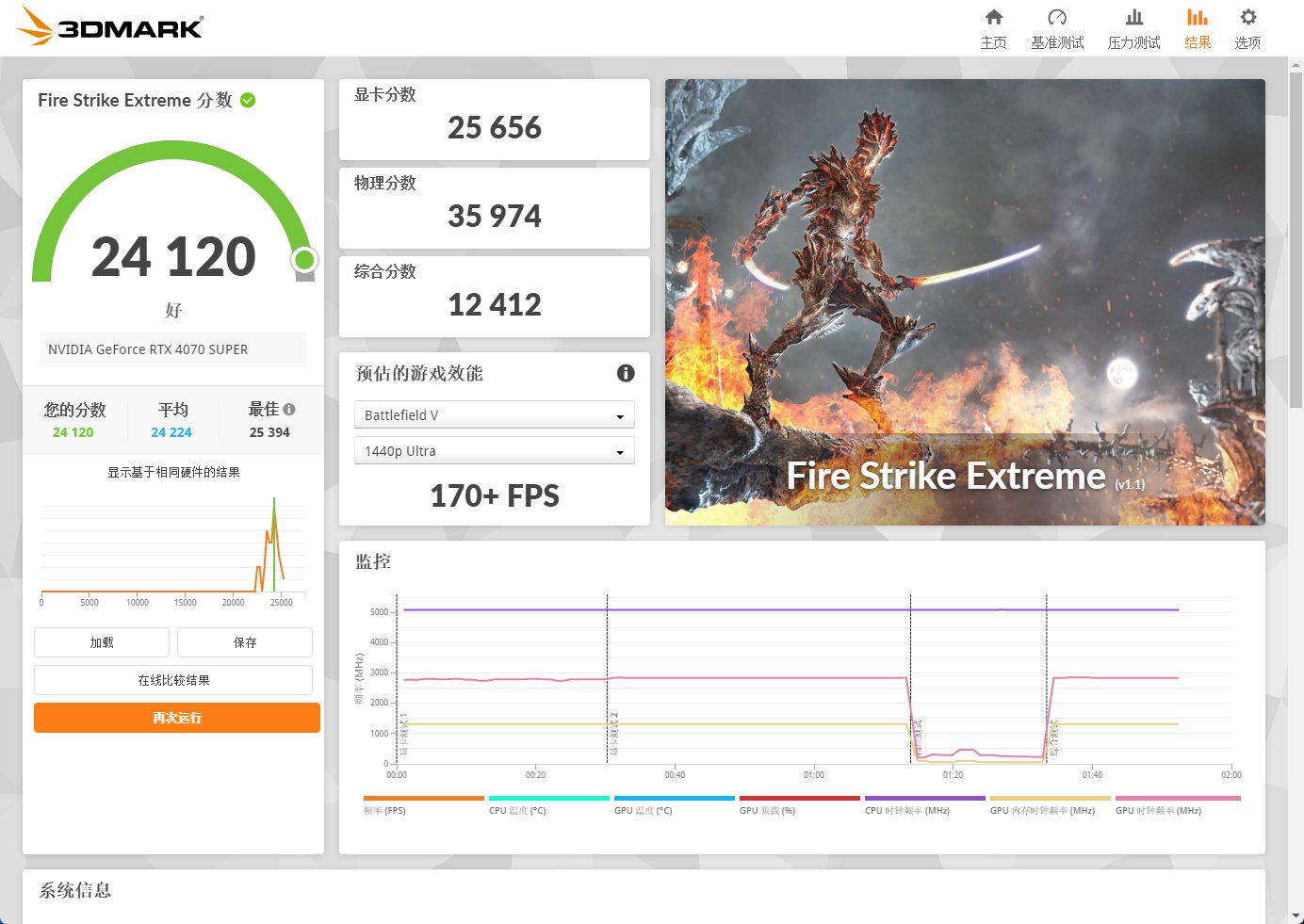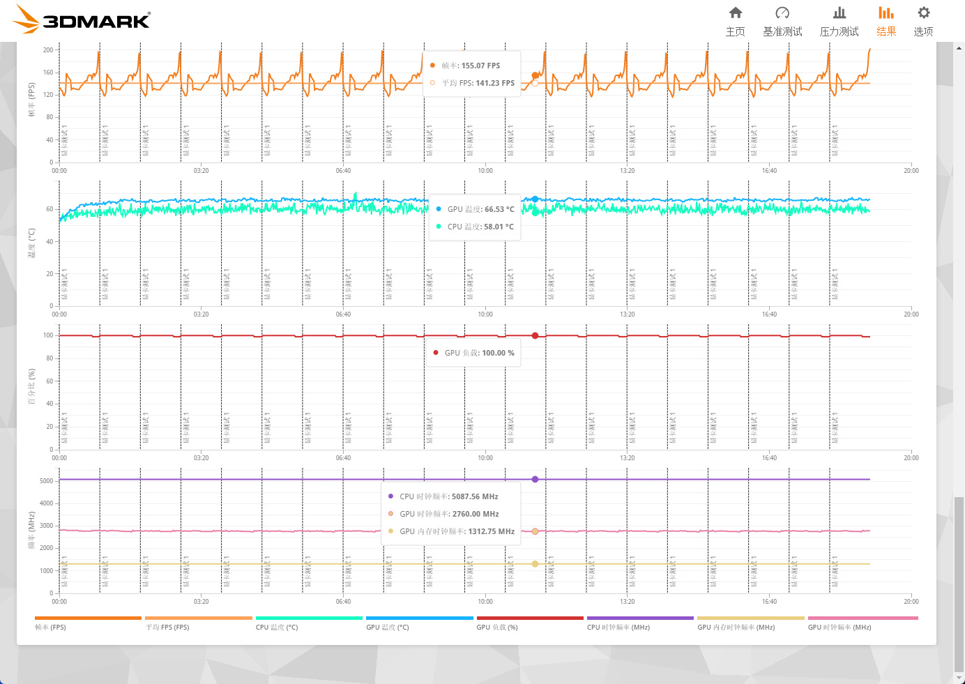 首先進行20輪的Timespy壓力測試,最終通過率99.5%。從詳細數據可以看到,盈通 RTX 4070 Super 櫻瞳花嫁在20輪的壓力測試中無論是幀數還是顯卡溫度都是一根直線,溫度穩定在66°C,頻率爲2760Mhz,20輪中得分最大差值也只有600左右。