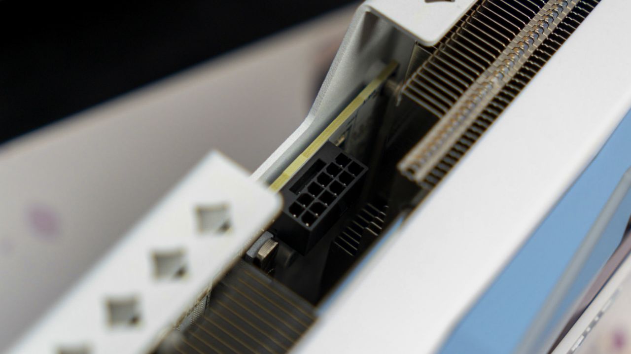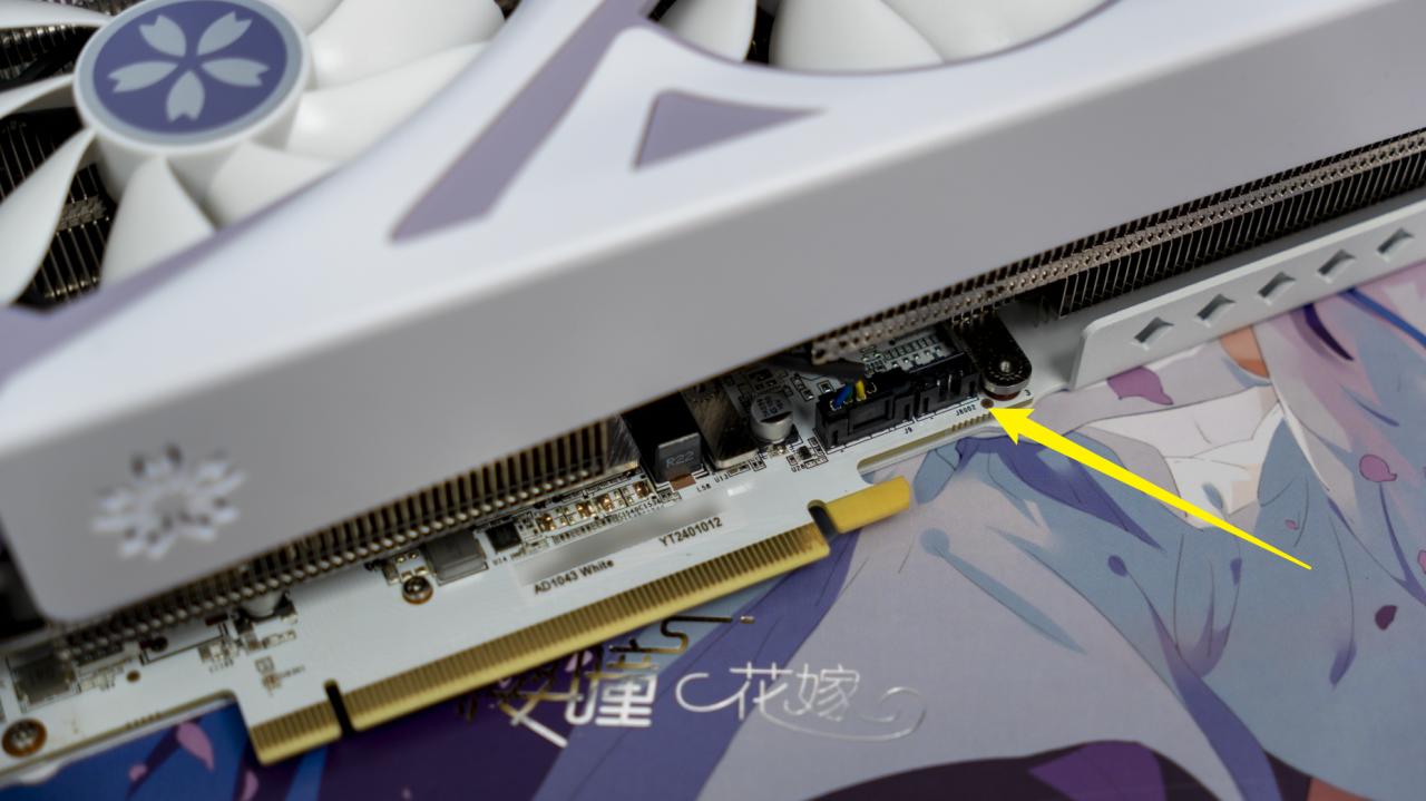 整張顯卡無論是散熱模組還是Pcie擋板以及PCB都採用了白色設計,在Pcie插槽位置,預留了一個4 Pin的風扇接口,在安裝時可以把機箱底部的風扇接上,讓底部風扇和顯卡保持同步轉速,更好的構建整個機箱的散熱風道。