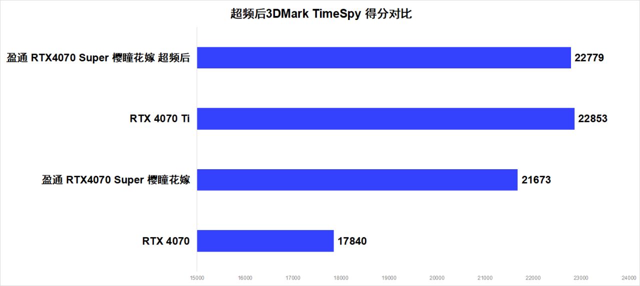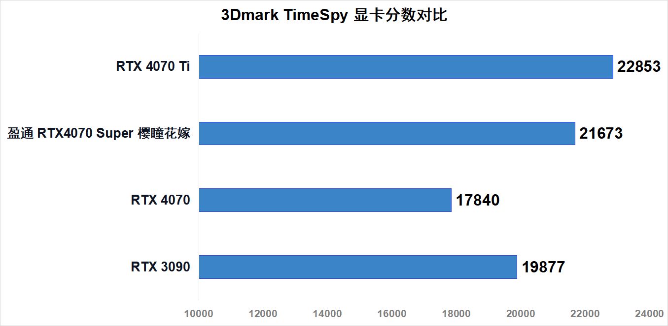 在代表DX12性能的3Dmark Time Spy測試中,盈通RTX 4070 Super櫻瞳花嫁展現出超越上代旗艦卡皇RTX 3090的優秀成績,與RTX 4070相比更是領先21%,相較RTX 4070 Ti有5%的小差距。
