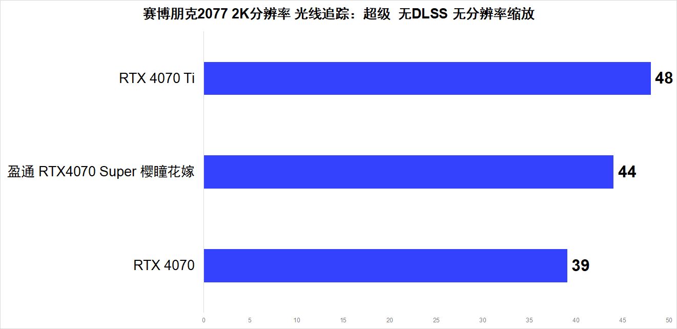 在開啓光追超級預設後,4070 Super的幀數會降至44幀,其他兩張顯卡也有大幅度的幀數下降,此時4070的成績只有39幀。