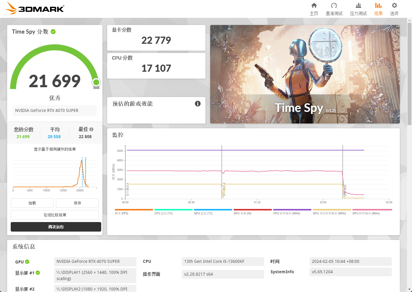 在超頻狀態下進行TimeSpy測試,此時TimeSpy的得分爲22779分,與RTX 4070 Ti的22853分相差微乎其微,幾乎可以媲美4070Ti的性能。相較於默認性能提升了5.1%,提升幅度還算可觀。
