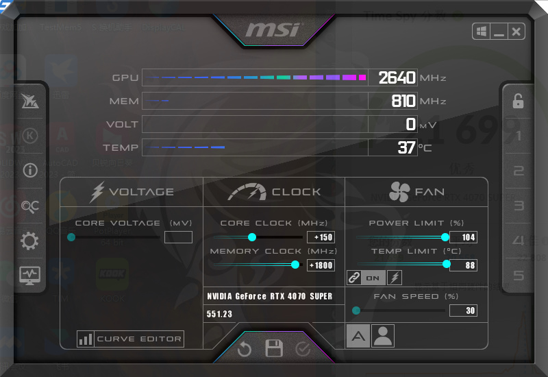 最後進入超頻測試,由於本身功耗限制,所以超頻空間並不大,最終成績爲顯存頻率+1800Mhz,GPU頻率+160Mhz。