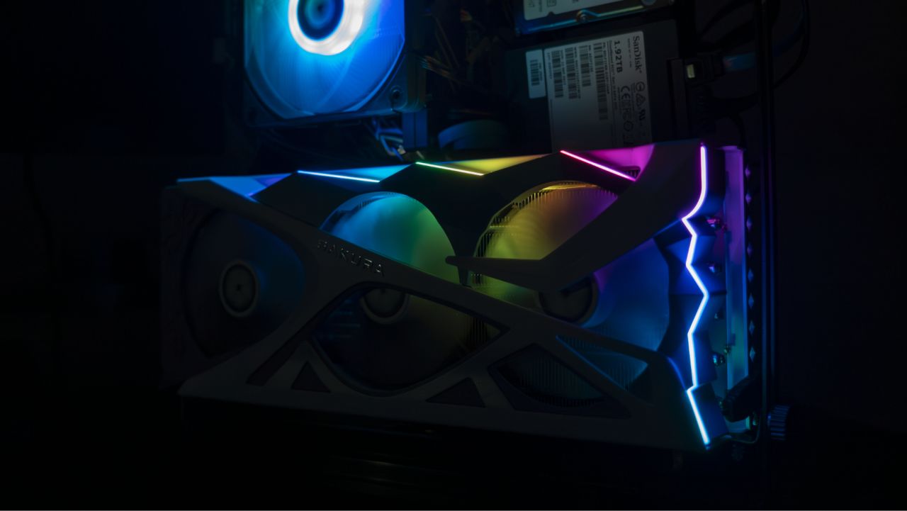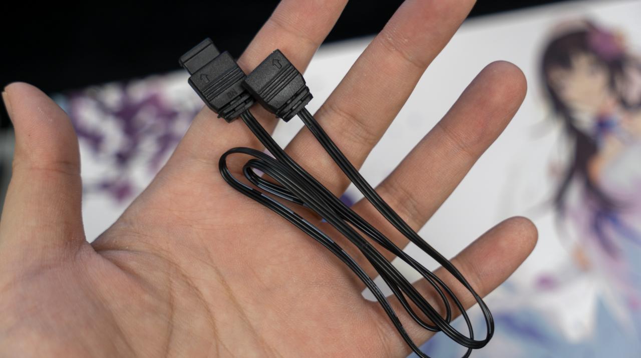 除了預留的風扇接口外,在顯卡尾部還有一個5V3針的ARGB接口,配合附送的ARGB延長線,可以讓顯卡和主板進行燈光同步。如果不差這根線的話,顯卡會在粉紫-淡藍色之間緩慢漸變。