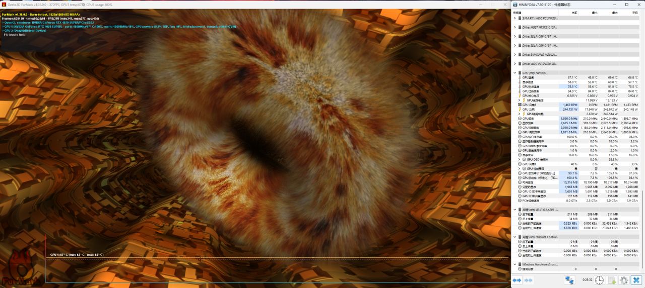 在20分鐘的滿負載壓力測試中,顯卡溫度最終穩定在67.1°C左右,而熱點溫度達到了78.5°C。