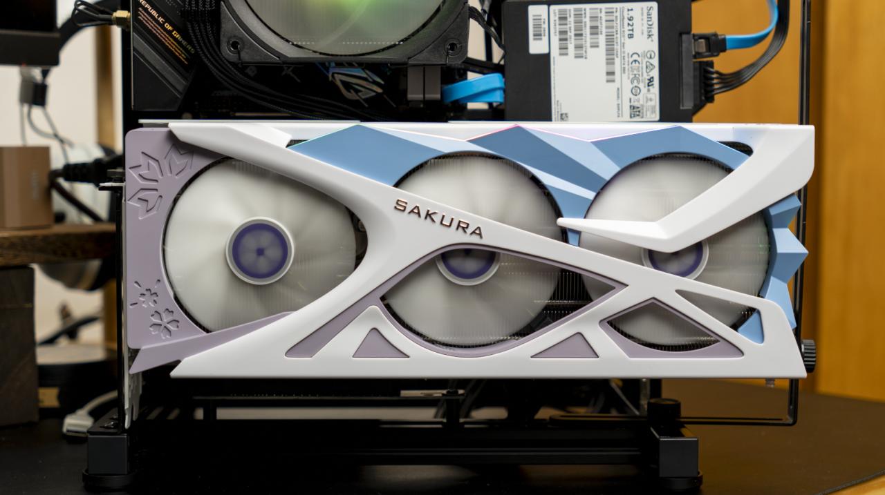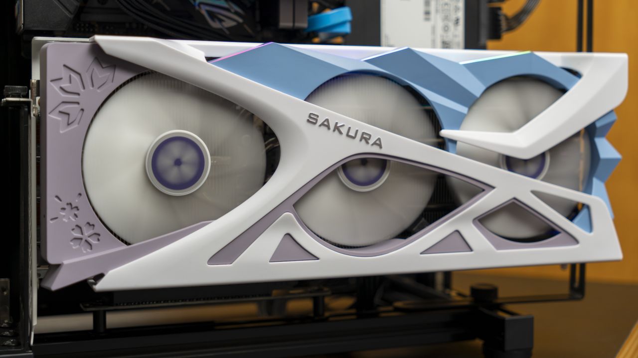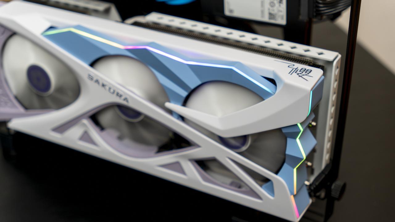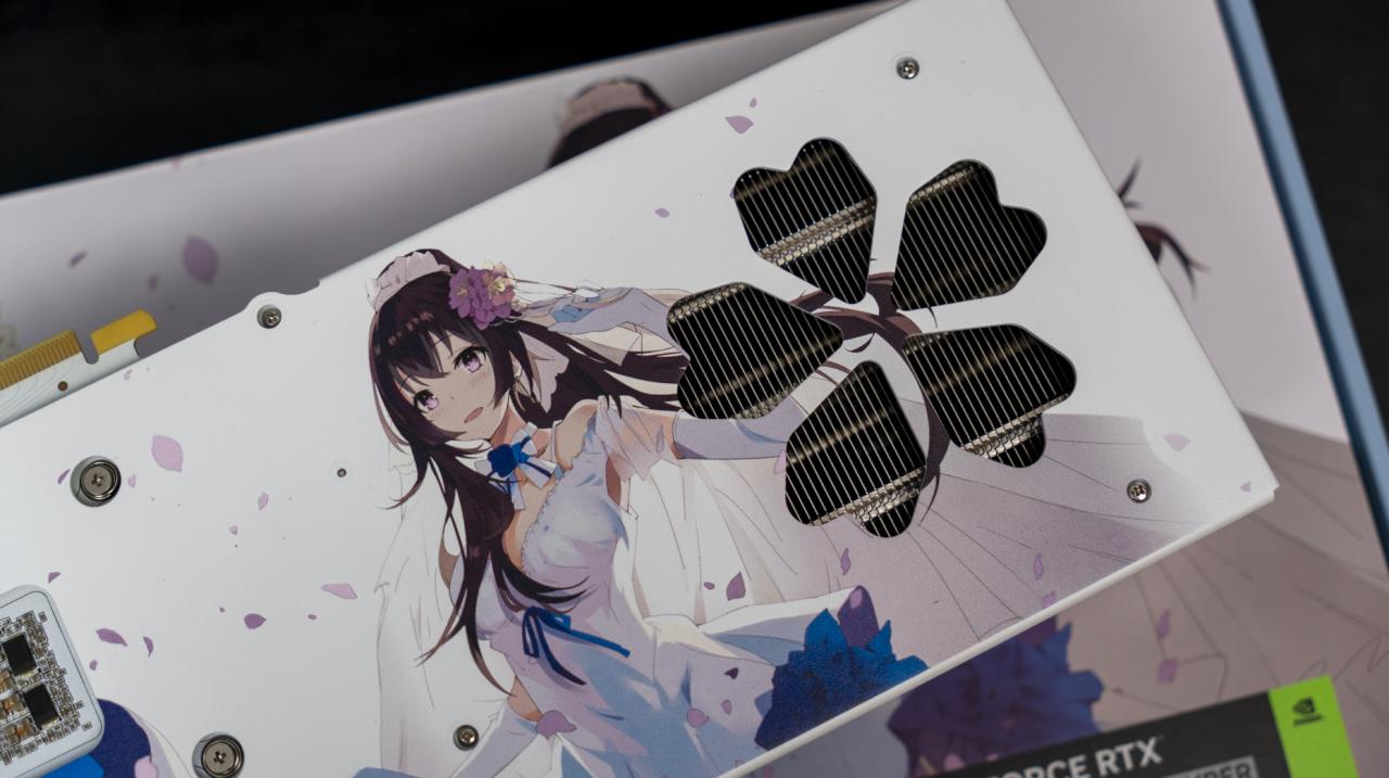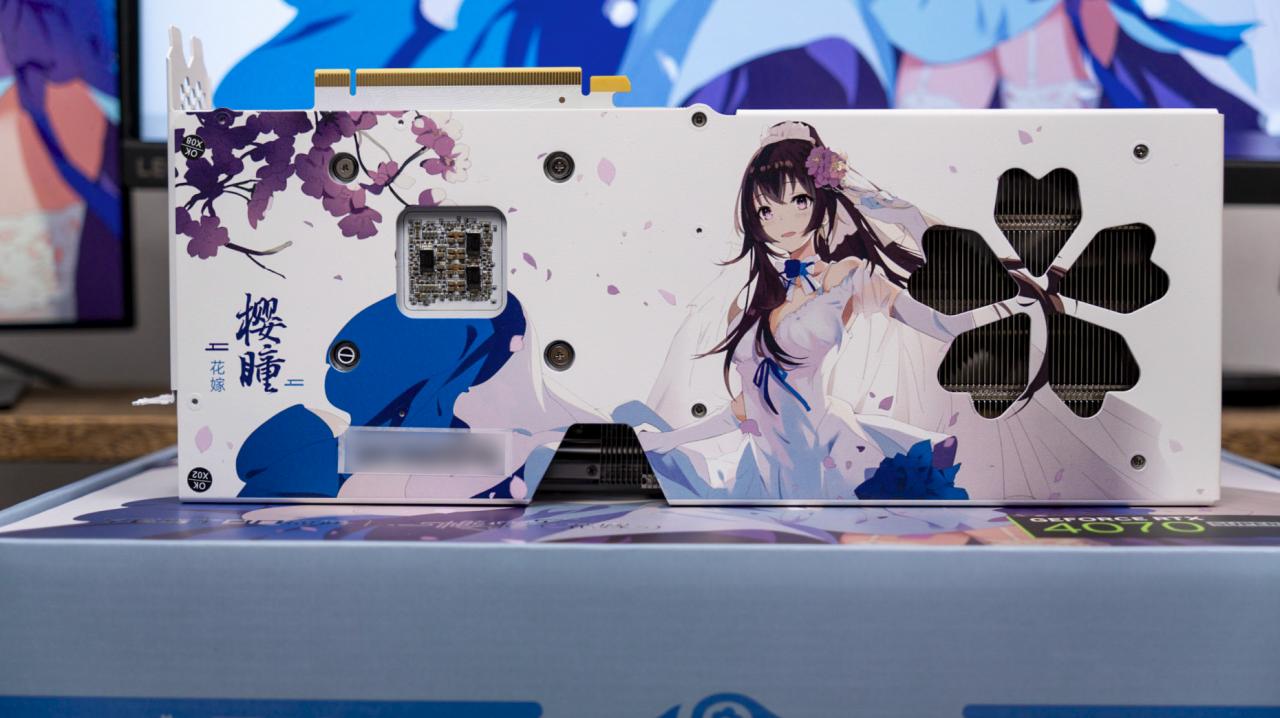 除了性能表現以外,外觀設計是這張顯卡的一大亮點。以櫻花和花嫁爲主題的外觀在現在的顯卡市場中頗有新鮮感,而且細節處理也很到位,顯卡背板上還有櫻瞳的可愛形象。這對一些有外觀有需求的玩家來說吸引力會更強。