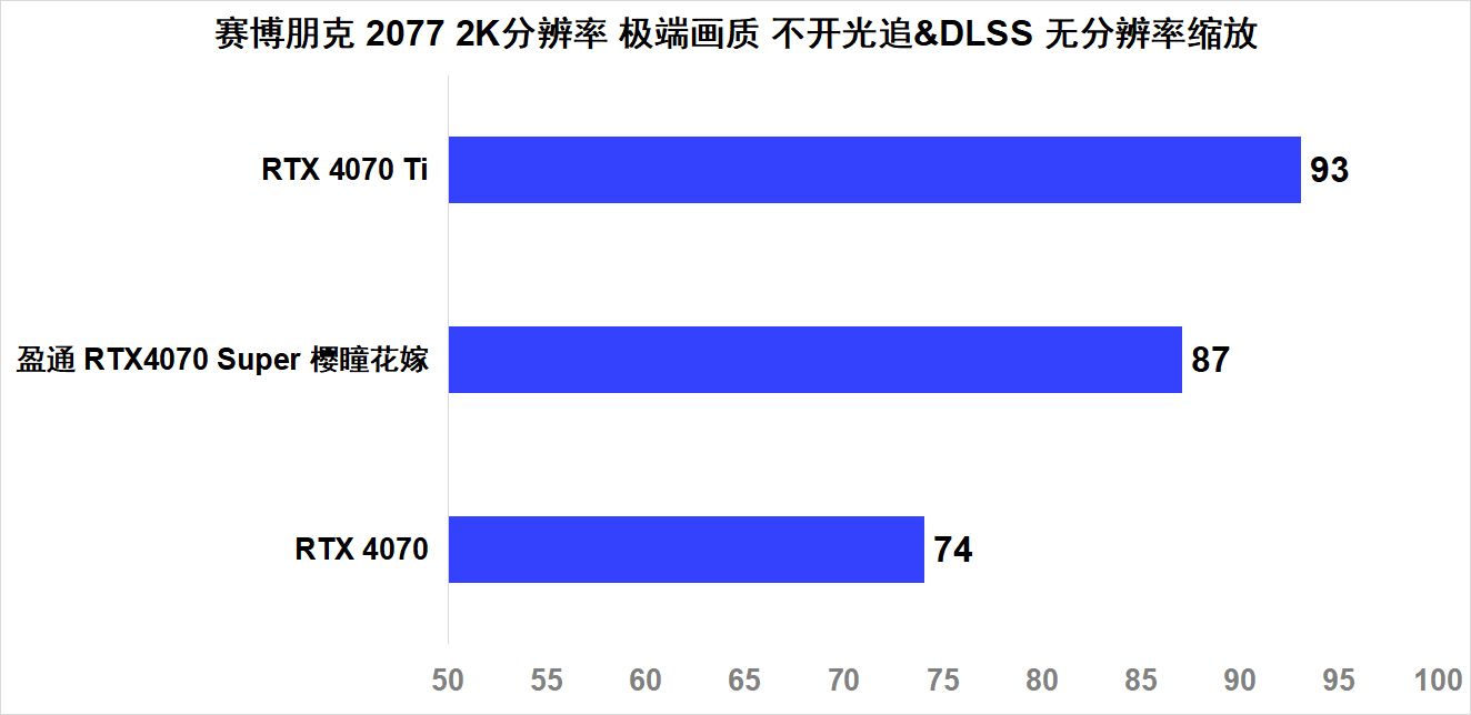 來看遊戲實測表現,首先來看2K分辨率下的賽博朋克2077,這個遊戲在默認的極端畫質預設下是默認開啓FSR2.1的,這裏把這個功能關掉來測試。儘管RTX 4070 Super和RTX 4070的理論性能差距達到了20%,但在遊戲測試中這兩張顯卡的表現會受到分辨率和多種因素影響,差距縮小到17%。
