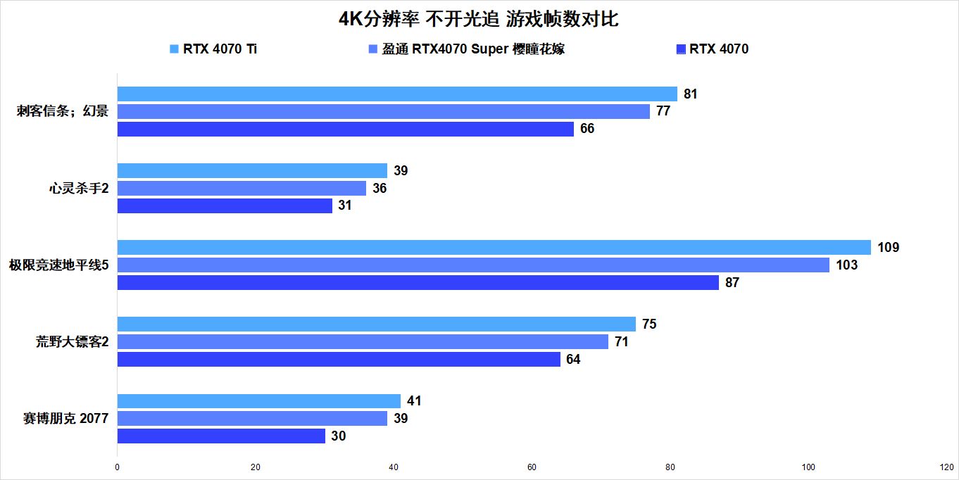 在4K分辨率下,除了心靈殺手和2077這種硬件殺手遊戲。4070 Super在未開啓DLSS的情況下都能應對大部分遊戲,平均幀數性能相比4070也要高出17%左右。