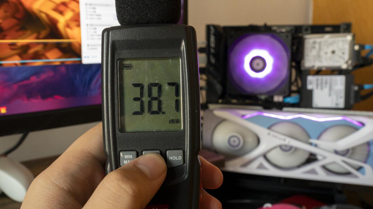 噪音方面,在距離顯卡50CM的地方測得的人位噪音爲38.7分貝,僅僅略高於周圍環境噪音水平。由於此次測試是在開放式測試機架上進行,顯卡產生的噪音要明顯高於正常裝機箱內的噪音。如果考慮在機箱內的實際情況的話,那麼噪音成績會更優秀。