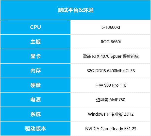 測試平臺使用13600KF,搭配32G DDR5 6400Mhz內存和750W電源,這也是大多數人在搭配這張RTX 4070 Super時會使用的配置,更能反映出實際情況。
