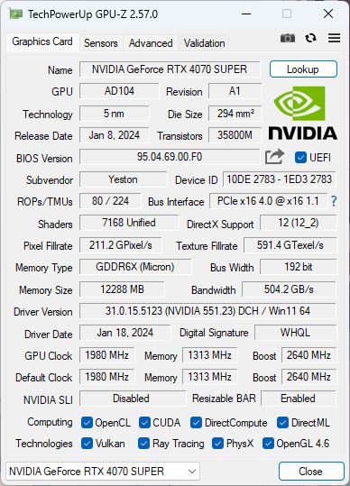 首先來看顯卡規格,盈通 RTX 4070 Super 櫻瞳花嫁的規格相比公版RTX 4070 Super均有一定提高。核心基礎頻率維持1980MHz不變,Boost頻率從2475MHz提升至2640MHz,TGP也從220W增加到245W。