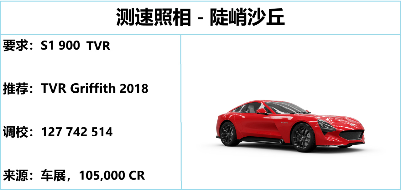 這是沙漠裏的測速點,可從左下角的公路開始加速(拉開 400 m+),最後路段不轉彎直線衝門即可。