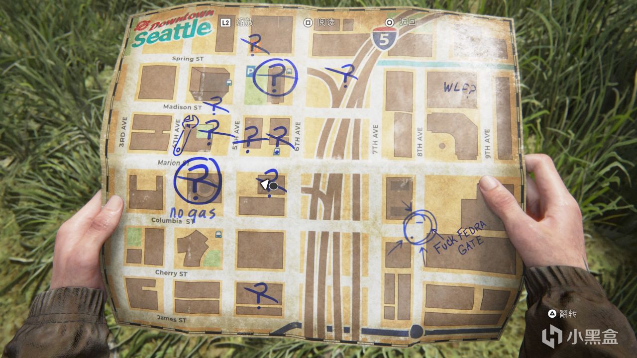路邊傾頹的危樓裏躺着一張遺囑,可憐的哥們到死都在惦記着自己藏在銀行裏的生存物資;騎馬路過的公交站牌上打滿了樂器店的廣告,酷愛吉他的艾莉自然不能錯過;故作聰明的WLF在城市的角落裏寫滿了暗語,其實將藏匿物資的地點暴露無遺……每一次艾莉通過這些小謎題推理出可探索地點的信息,她都會在導遊圖上標註出對應的建築物範圍,玩家要做的就是打開地圖——定位位置——找到道路——強行闖入,每完成這一套強盜版的解密流程,玩家都會收穫不小的意外之喜。