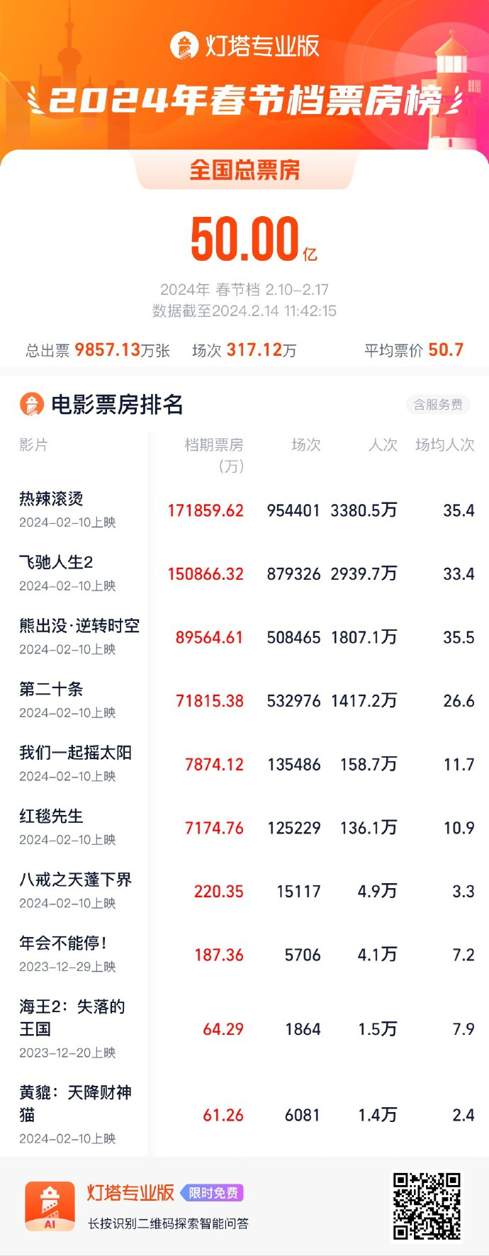 據燈塔專業版數據,截至2月14日11時42分,2024年春節檔(2月10日—2月17日)檔期總票房(含預售)突破50億!《熱辣滾燙》《飛馳人生2》《熊出沒·逆轉時空》暫列檔期票房前三位。
