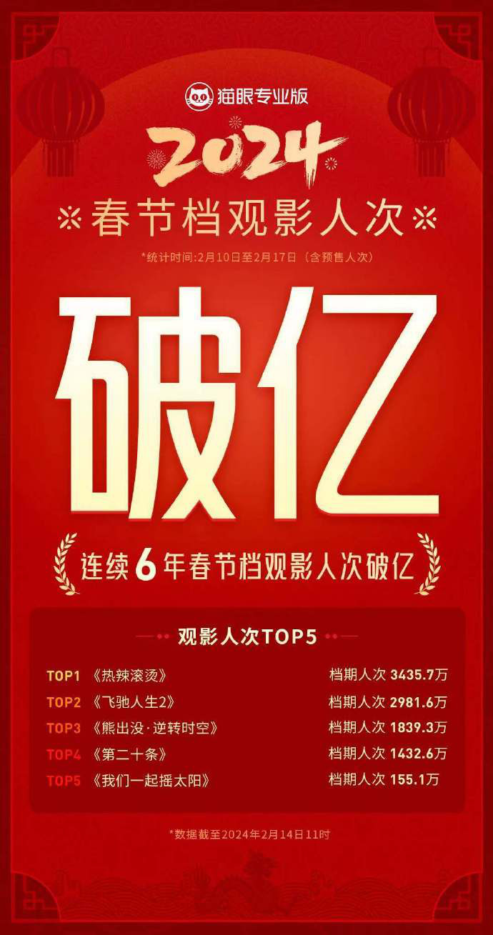 至此,2024年春節檔觀影人次突破一億人,春節檔已連續6年觀影人次破億。