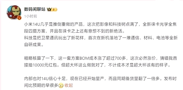 ◆ 定價策略:小米 14 Ultra幾乎是“推倒重做”的產品,用上全新徠卡光學全焦段四攝方案,“在徠卡之上還有意想不到的新絕活”。——還將首發涉及通信、材料、電池等多方面的自研技術,與此同時,衛星通訊也被“玩出了新花樣”。