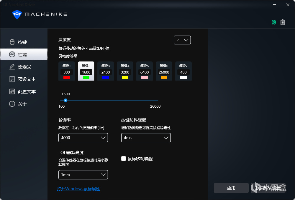 在官方提供的驅動中提供了最高7檔的DPI調節以及回報率設置,靜默高度等等: