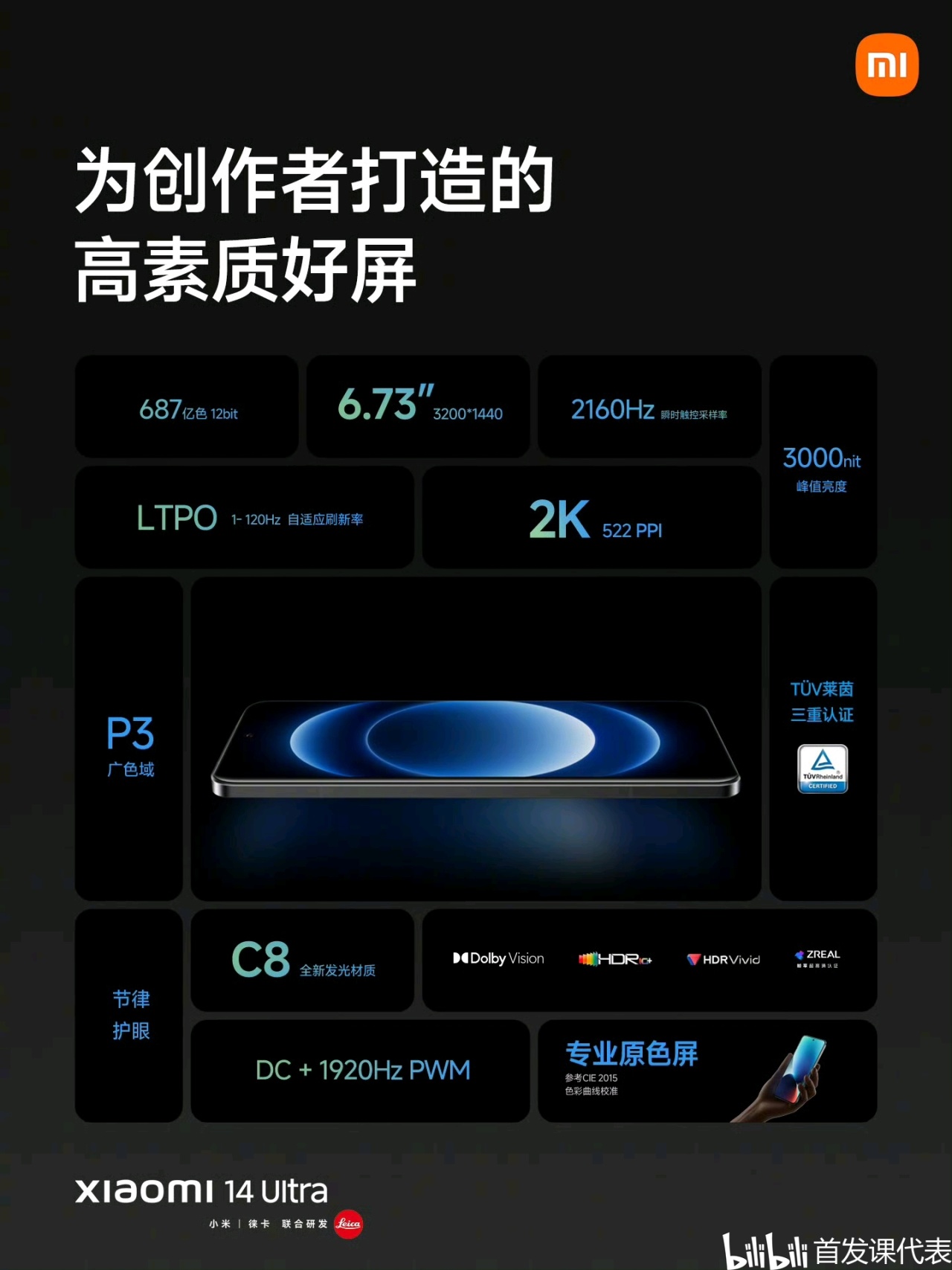 ◆ 屏幕:6.73 英寸 3200×1440 OLED 等深四曲屏,華星 C8 發光材料,局部峯值亮度 3000nit,12bit 色深,支持 1−120Hz LTPO 無級高刷,支持類 DC 調光和 1920Hz 高頻 PWM 調光,小米龍晶玻璃蓋板;