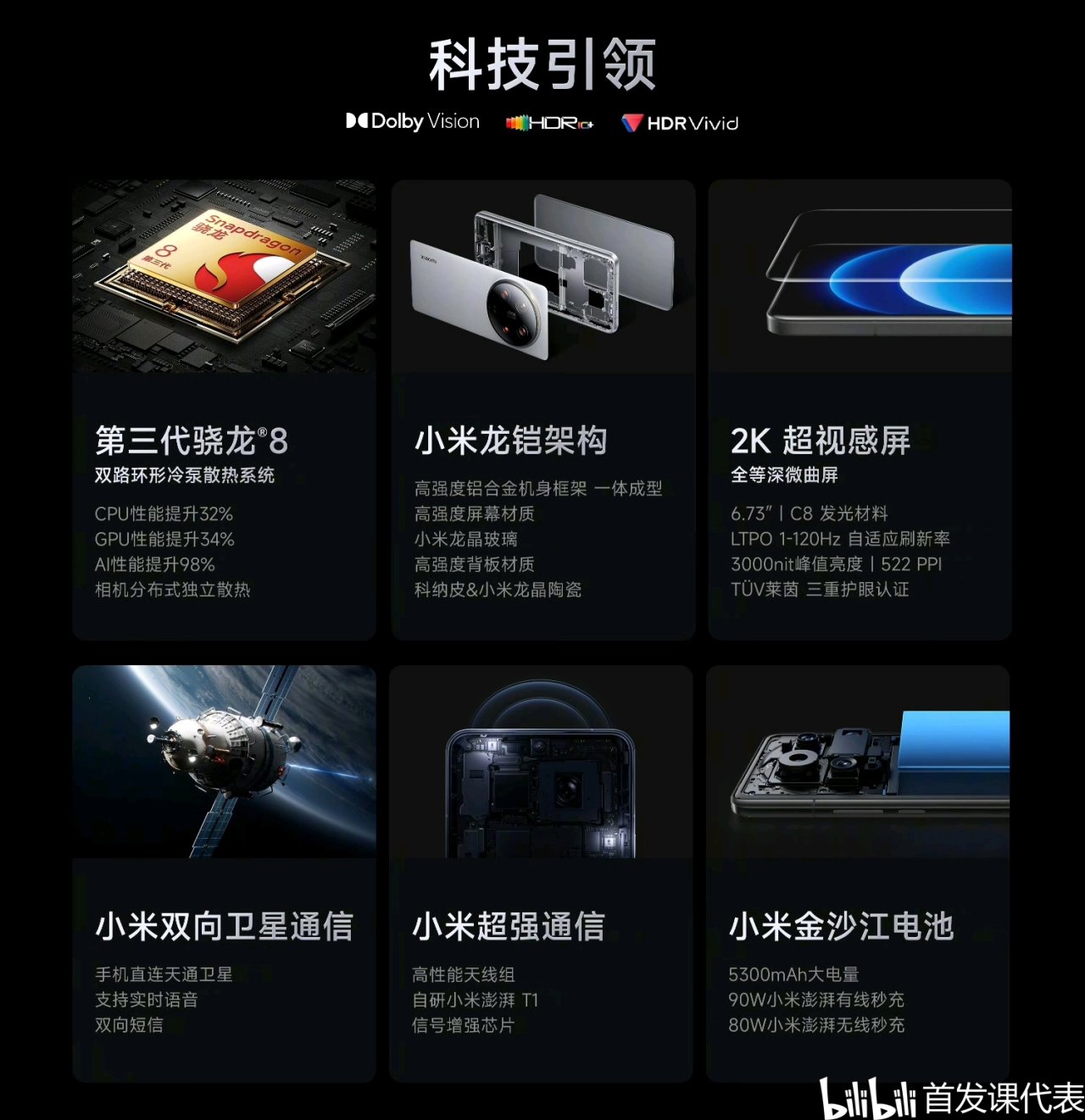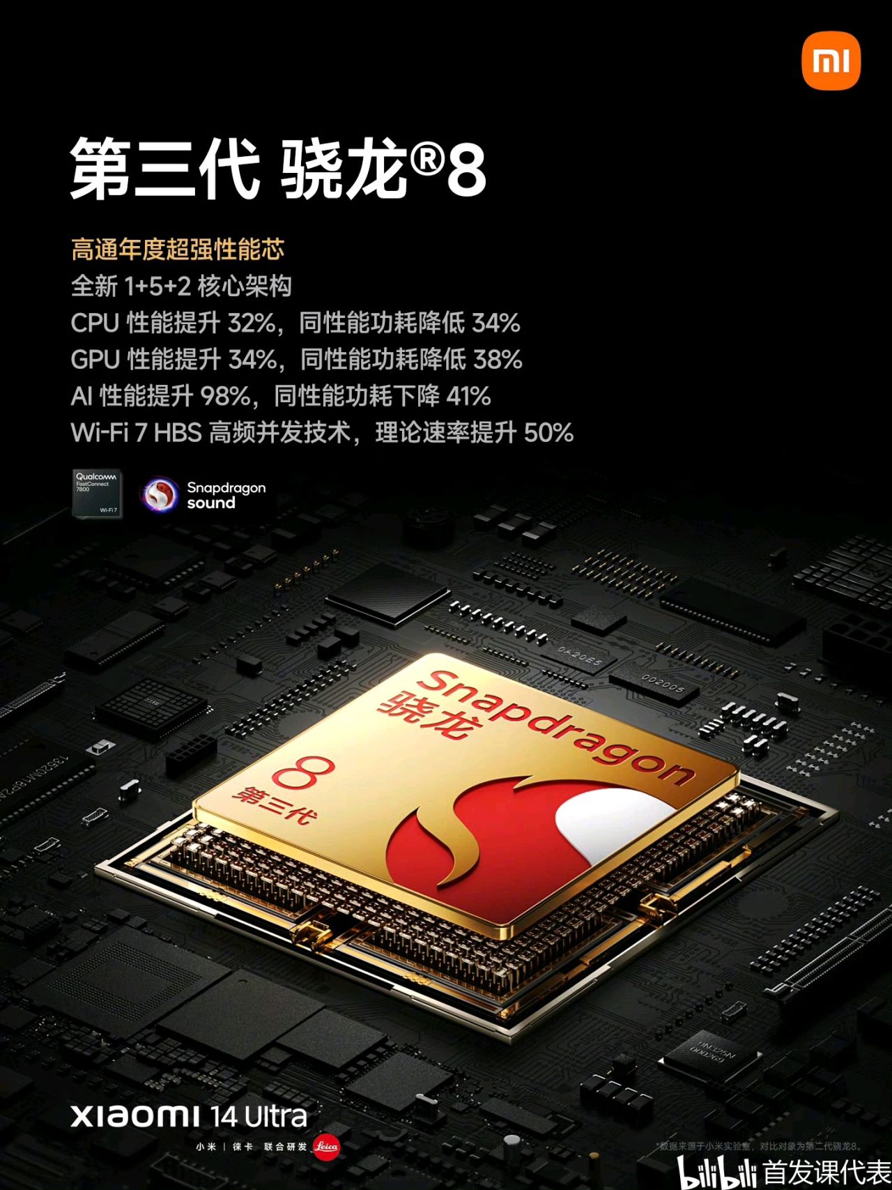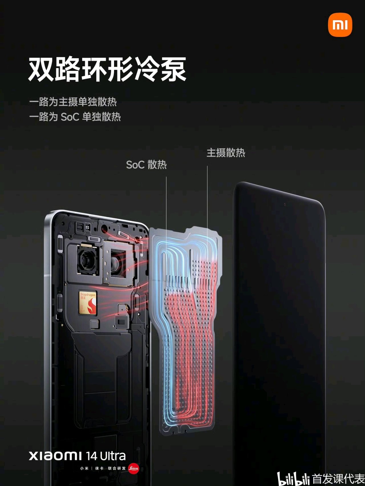 ◆ 芯片:驍龍 8 Gen 3,配備LPDDR5X 內存,UFS 4.0 閃存,4000m㎡ 雙路環形冷泵,雙小米澎湃 T1 信號增強芯片;