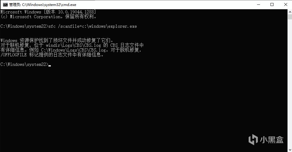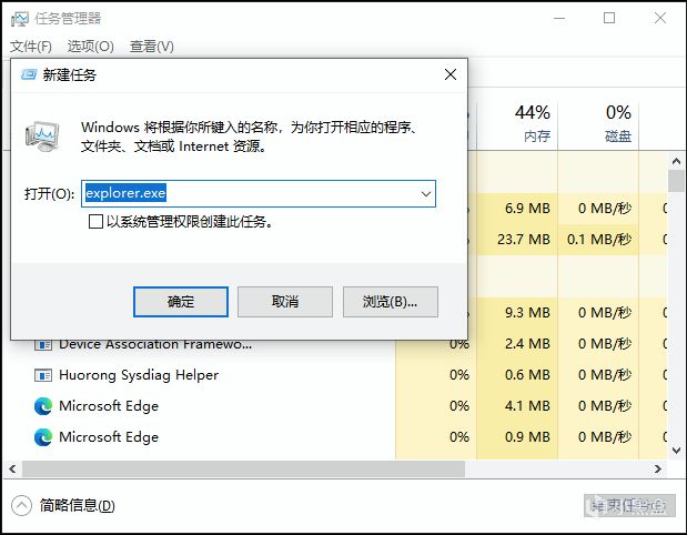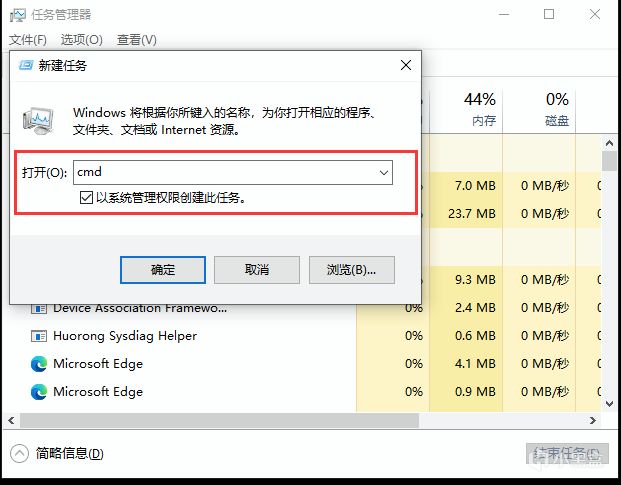 5. 升級後,再點擊任務管理器的文件--運行新任務--輸入cmd,勾選“以系統管理權限創建此任務”--在cmd窗口輸入sfc /scanfile=c:\windows\explorer.exe回車
