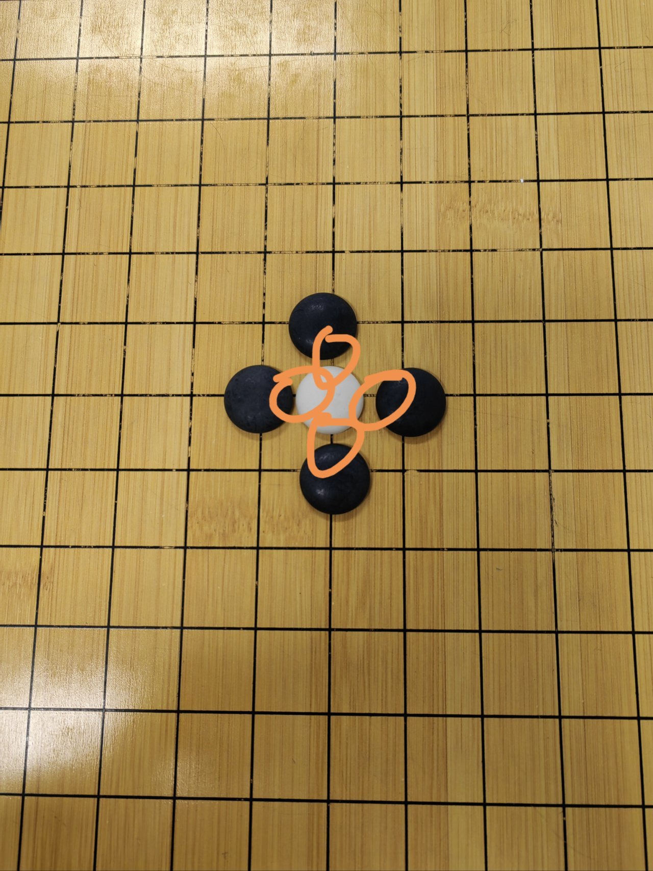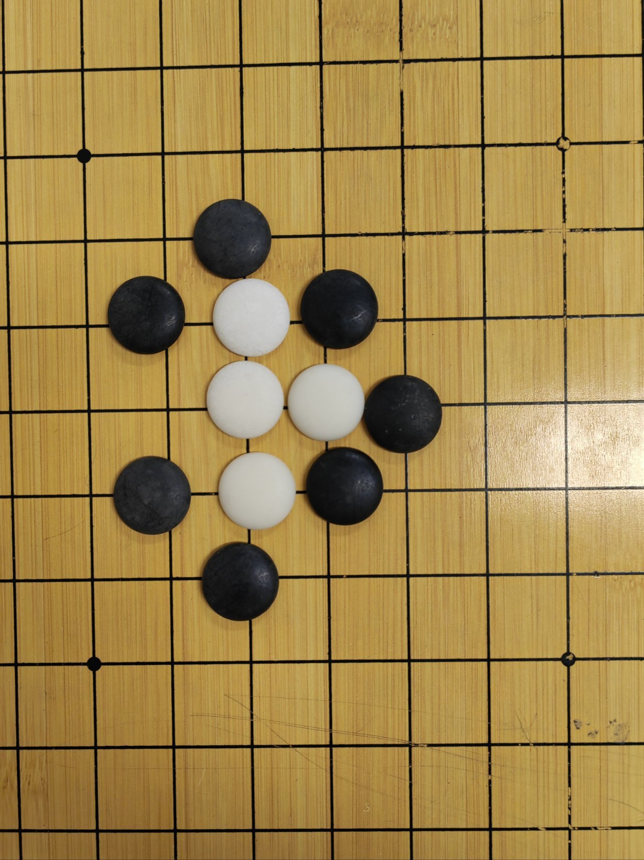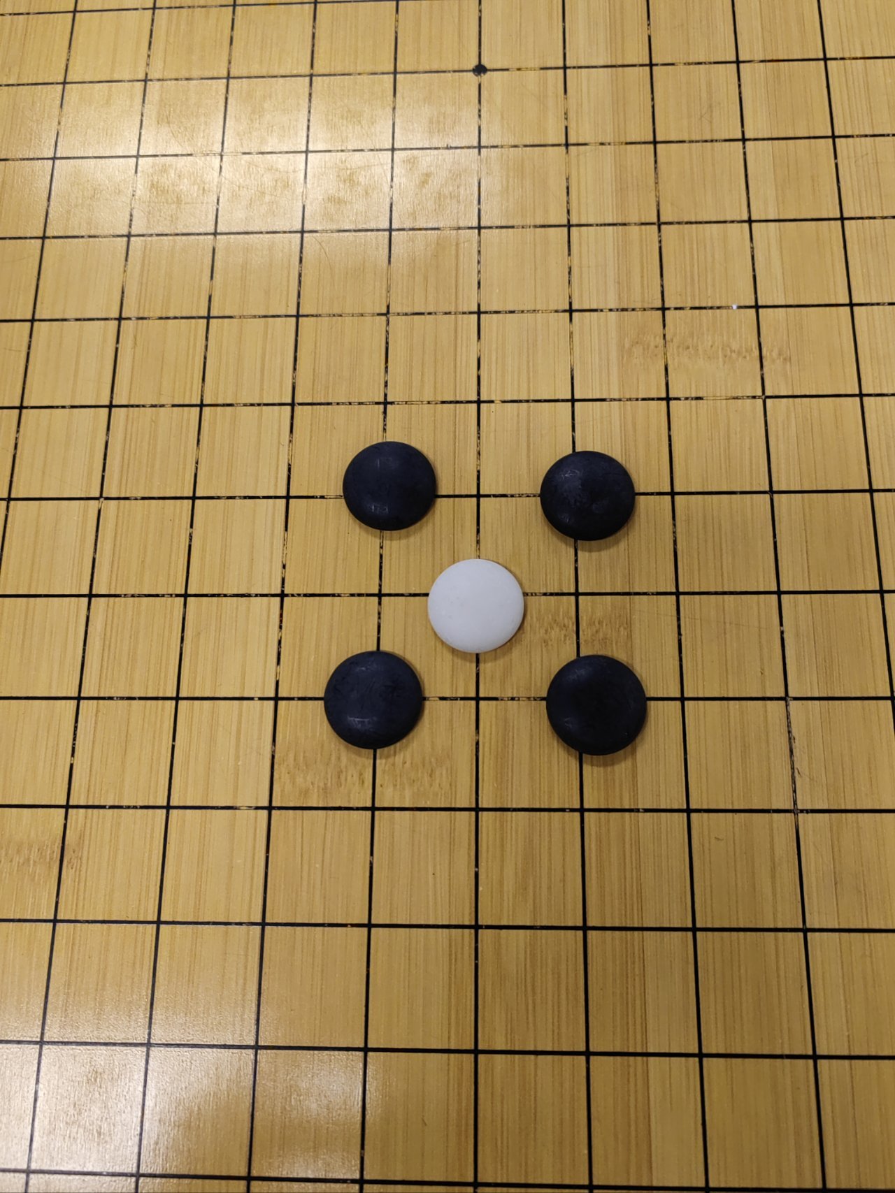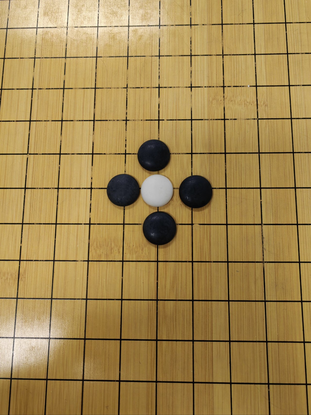 大家可以看到,上圖白棋周圍所有被短線連接的交叉點都被對方佔據了。這樣的話,白棋這顆子就“HP=0”了,用圍棋的術語說就是“沒有氣了”,就嗝屁了,所以通常情況下,一顆子有4口氣。就需要把它從棋盤上拿下來。也就變成了這樣: