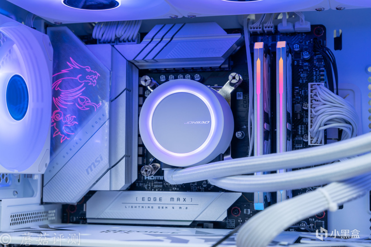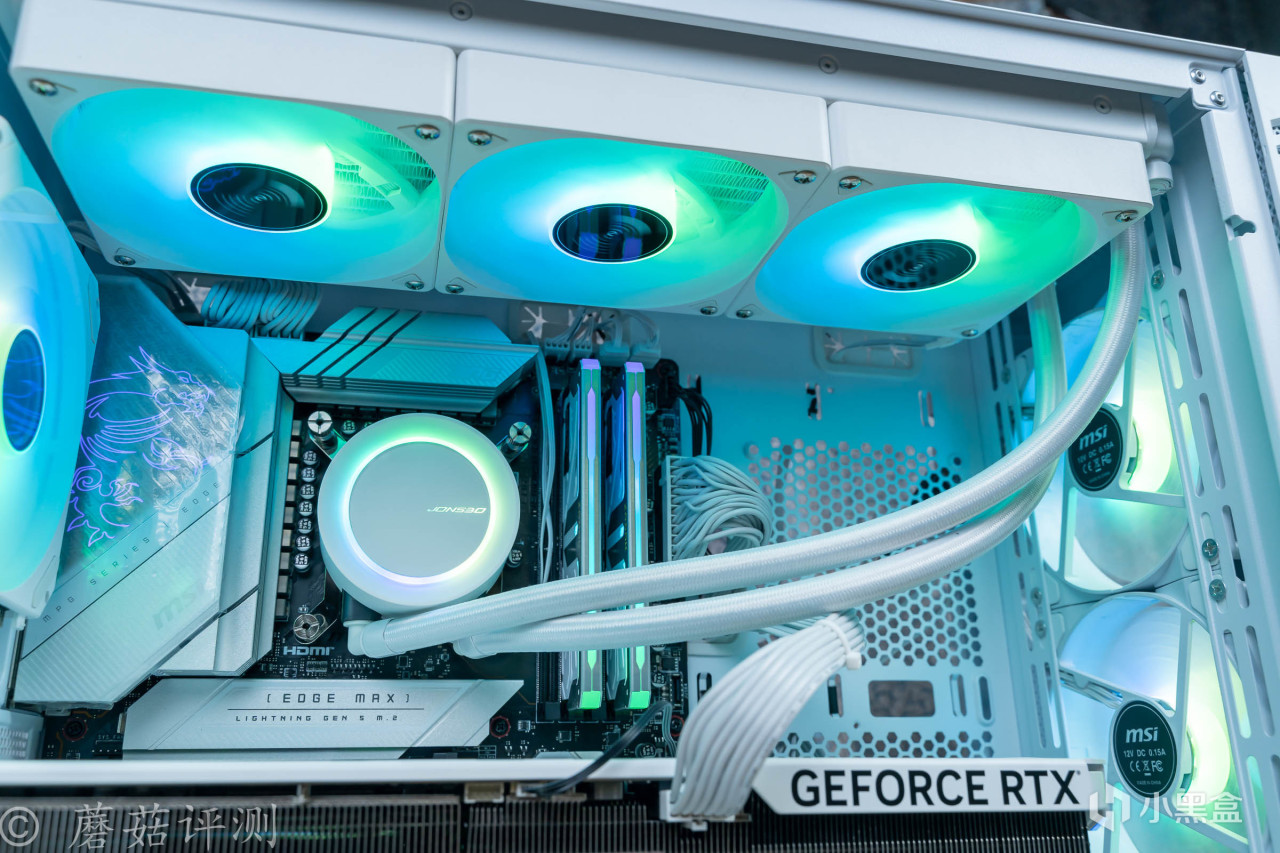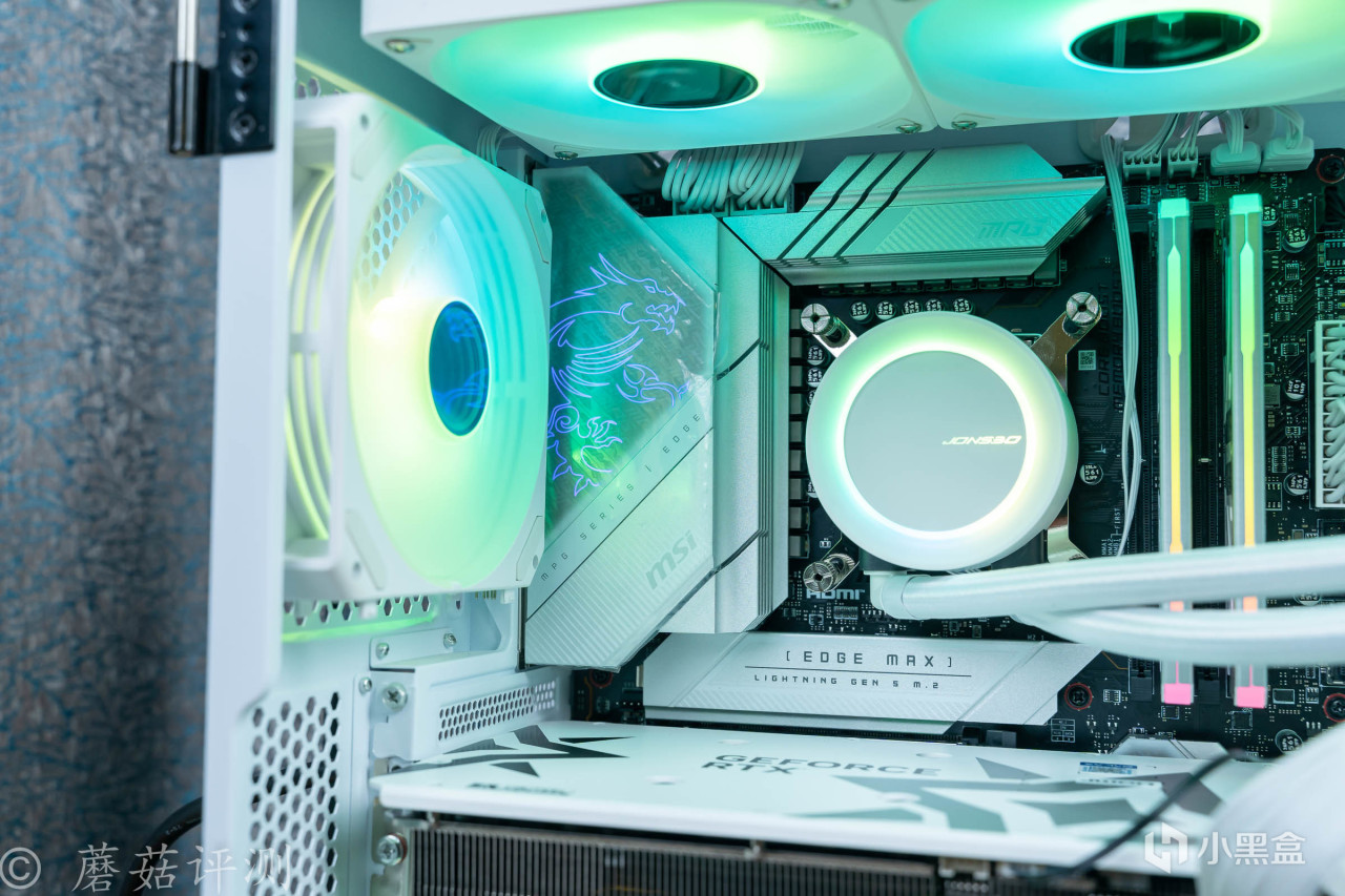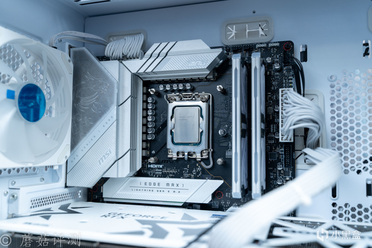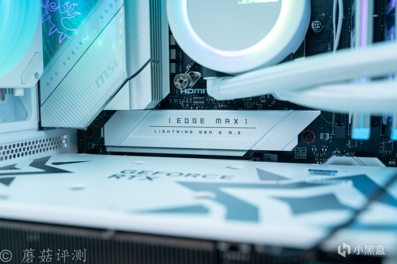 ▼主板是微星的Z790 EDGE TI MAX,這塊主板正面覆蓋有大面積的金屬件,都是白色的,搭配白色主題整機正合適。另外在主板供電散熱件的左側頂部,還有燈效飾板,微星經典的龍標LOGO,支持ARGB燈效,支持主板同步。
