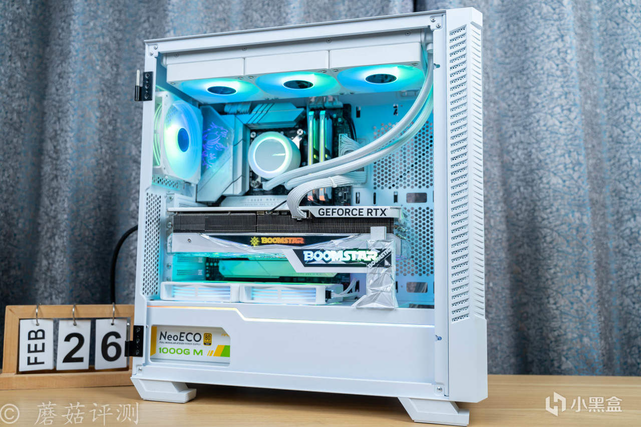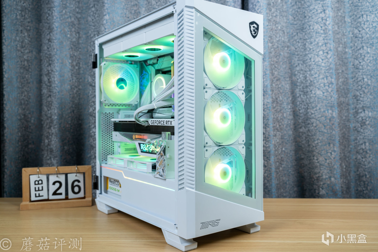 ▼機箱是微星的刀鋒100R白色版,這款機箱的前部、側面標配有大面積的側透玻璃,白透的,通透性更好,可以更好的展示機箱內部的各種硬件。機箱前部還標配了三把白色的、支持ARGB燈效的機箱風扇,可以在機箱前部提供充足的進風,搭配前部的白色側透玻璃效果也很棒。