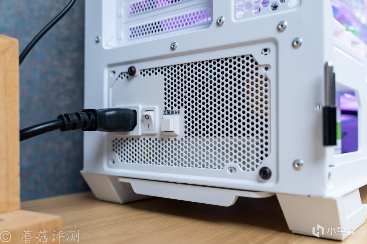 ▼電源尾部,除了標配的電源插口和開關之外,還有一個按鈕,這個按鈕可以控制電源散熱風扇的轉速,在靜音模式下,電源散熱風扇在電源低負載的時候會停轉,進一步降低電源待機噪音,讓主機整體待機時更加安靜。