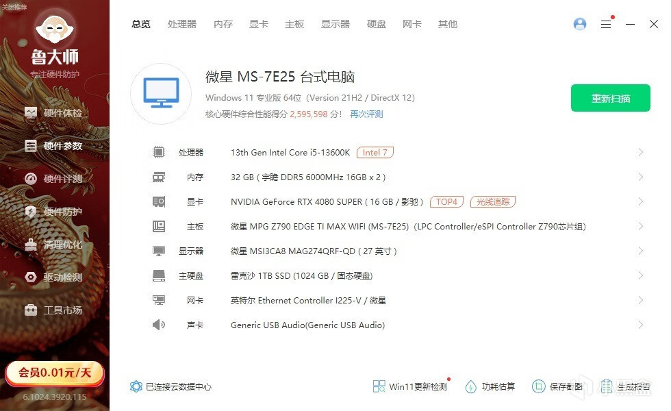 ▼整機配置一覽,處理器是13600K,主板是微星的Z790 EDGE TI MAX,顯卡是影馳的RTX4080 Super星曜OC。